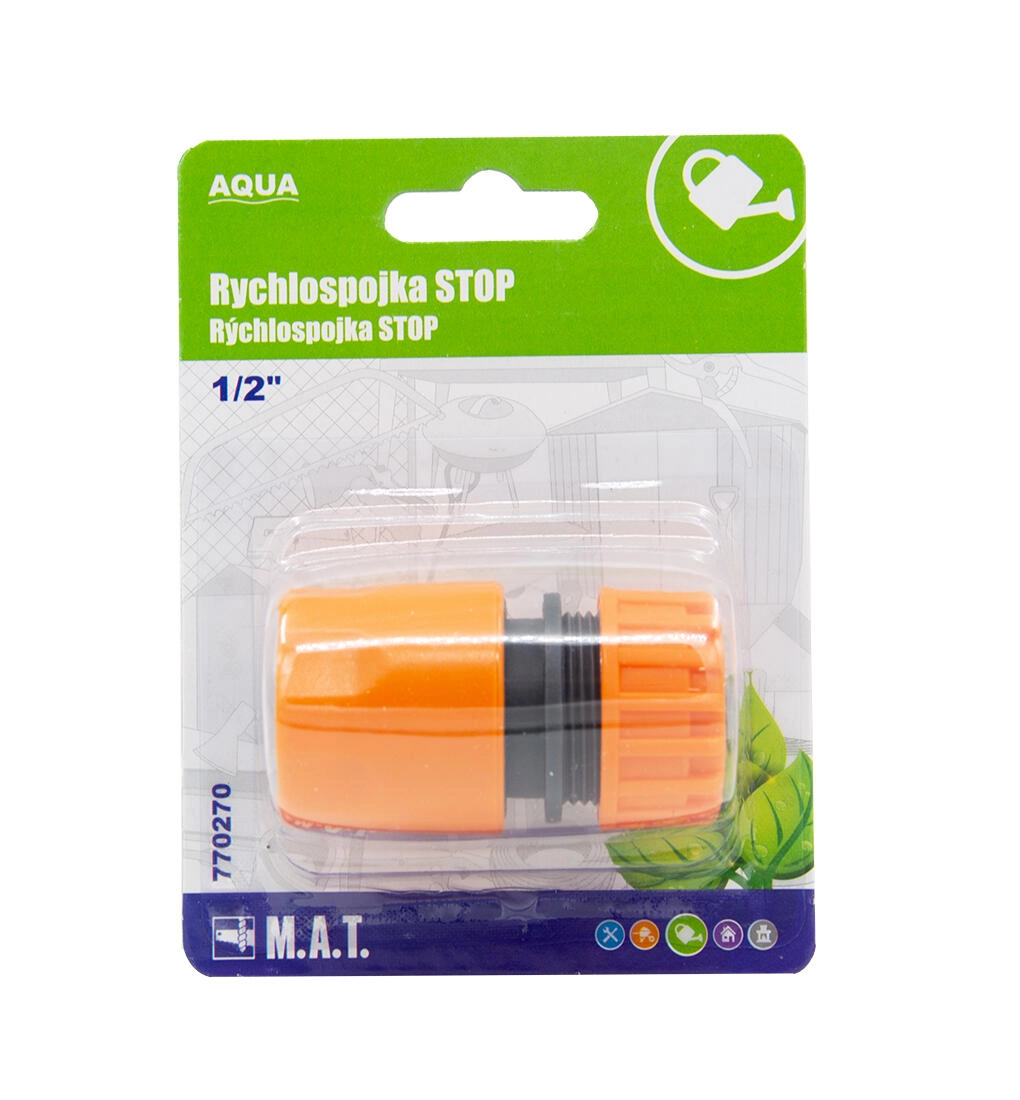 Raccord rapide avec clapet d’arrêt 1/2" AQUA pour un branchement facile et rapide du tuyau d’arrosage. Le clapet d’arrêt ferme automatiquement le débit lors du débranchement des accessoires, donc aucune éclaboussure inutile. Conception robuste et étanchéité fiable pour un arrosage sans problème.