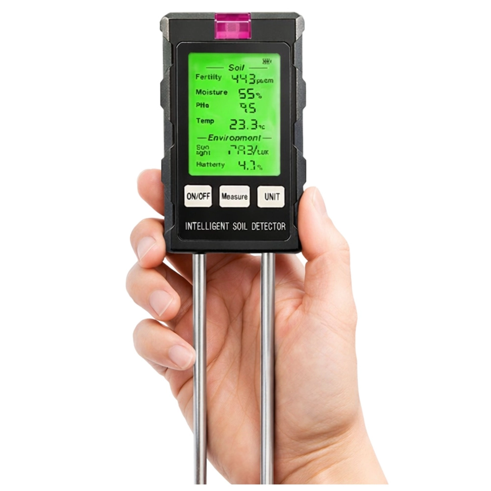 Le mesureur de sol intelligent 6-en-1 vous donne un contrôle total sur la culture. Sur un seul écran rétroéclairé, il suit l’humidité du sol, le pH, la température, l’intensité lumineuse, la fertilité/nutriments et l’humidité de l’air. Grâce à une sonde double sensible, il mesure rapidement et avec précision, et le changement d’unités de température facilite l’utilisation à la maison, au jardin et en serre.
