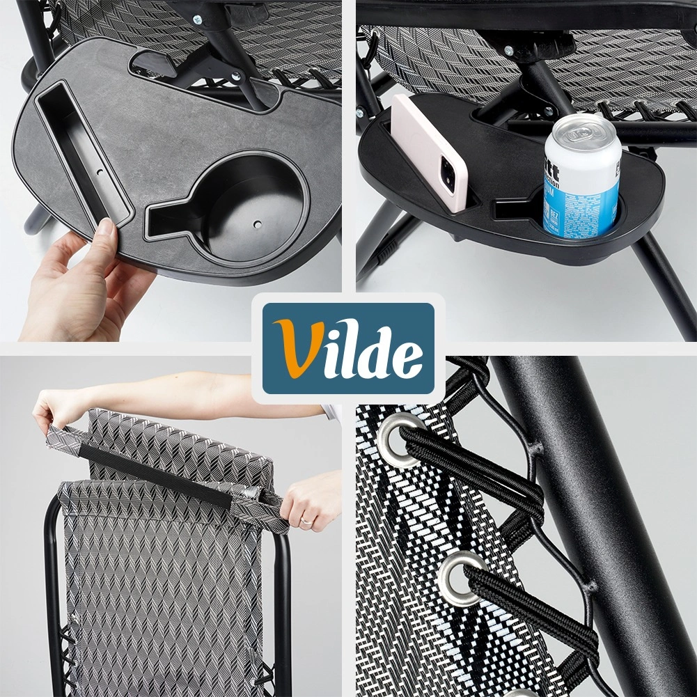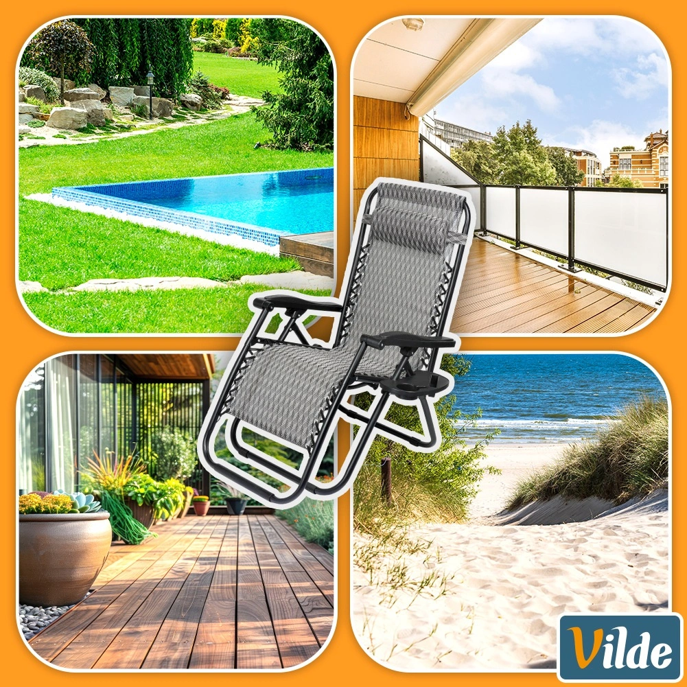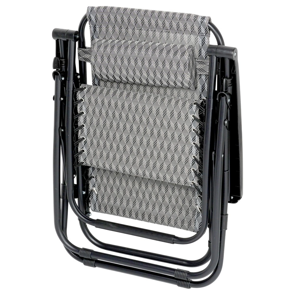 Le réglage gravitationnel permet de changer facilement la position du corps pour un confort maximal lors de la lecture, du bain de soleil ou de la détente. Sa structure métallique stable supporte jusqu’à 120 kg et la toile en polyester robuste de couleur grise à motif géométrique garantit une longue durabilité, même en extérieur.