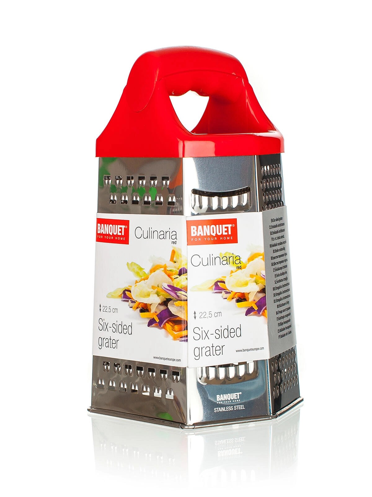 Découvrez un assistant universel pour la cuisine : la râpe inox CULINARIA à six faces, hauteur 22,5 cm. Chaque face propose un type de surface différent pour un travail optimal des ingrédients – du râpage très fin façon poudre, au râpage moyen et grossier en filaments, jusqu’aux surfaces de tranchage pratiques. Le corps robuste en acier inoxydable 430 (18/0) et la poignée solide en ABS assurent une prise ferme, une grande stabilité et une longue durabilité.