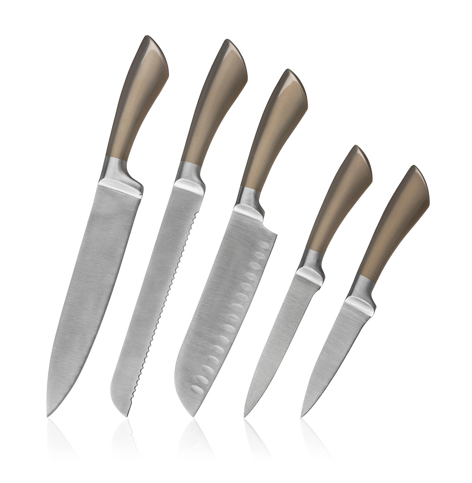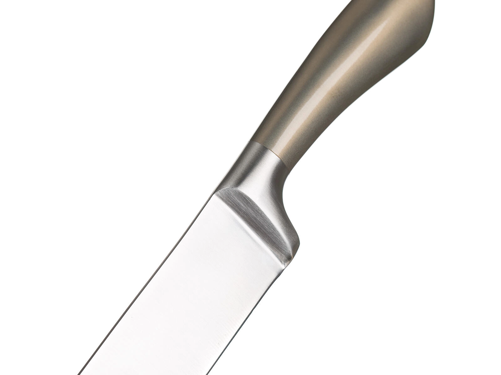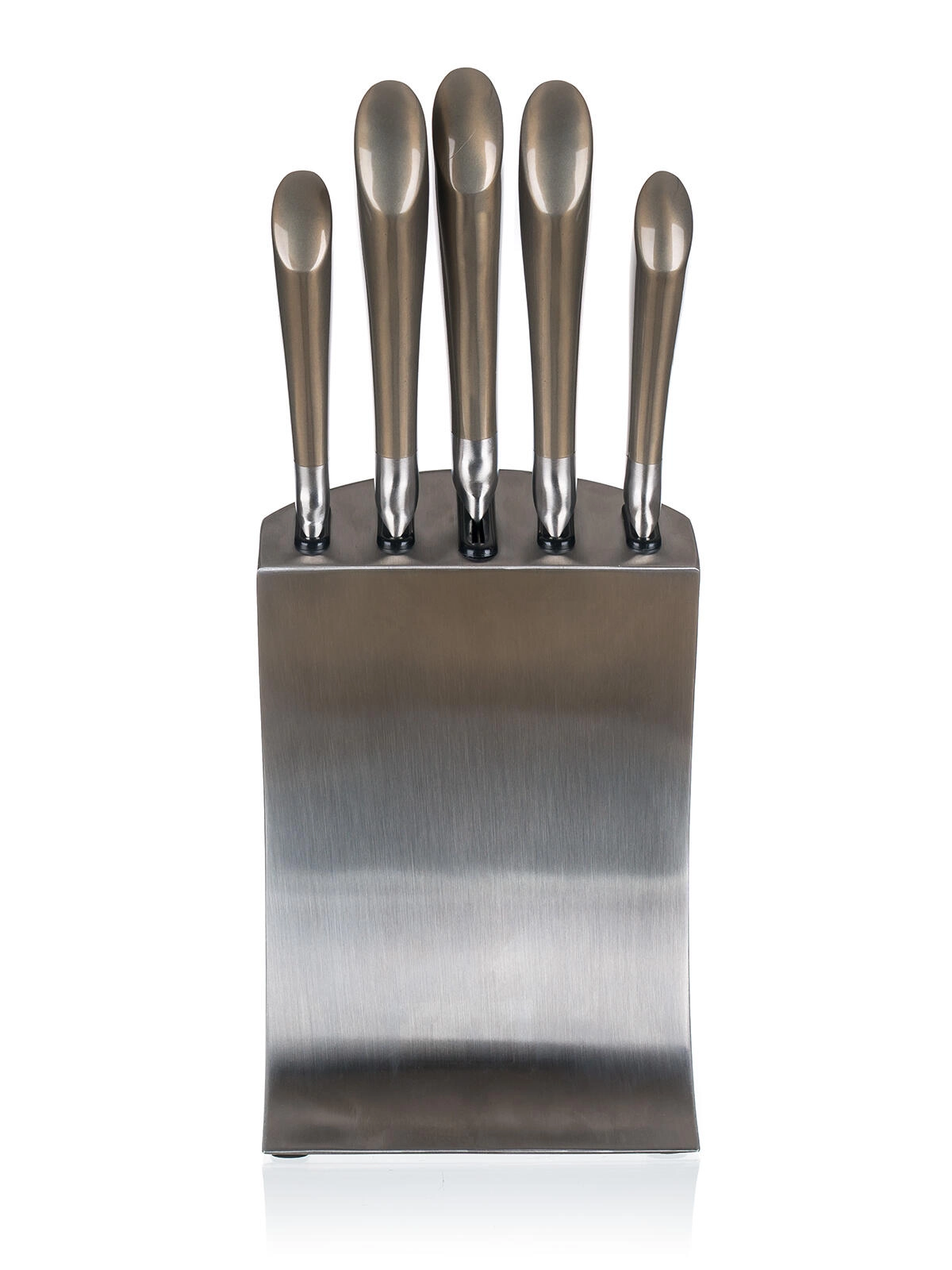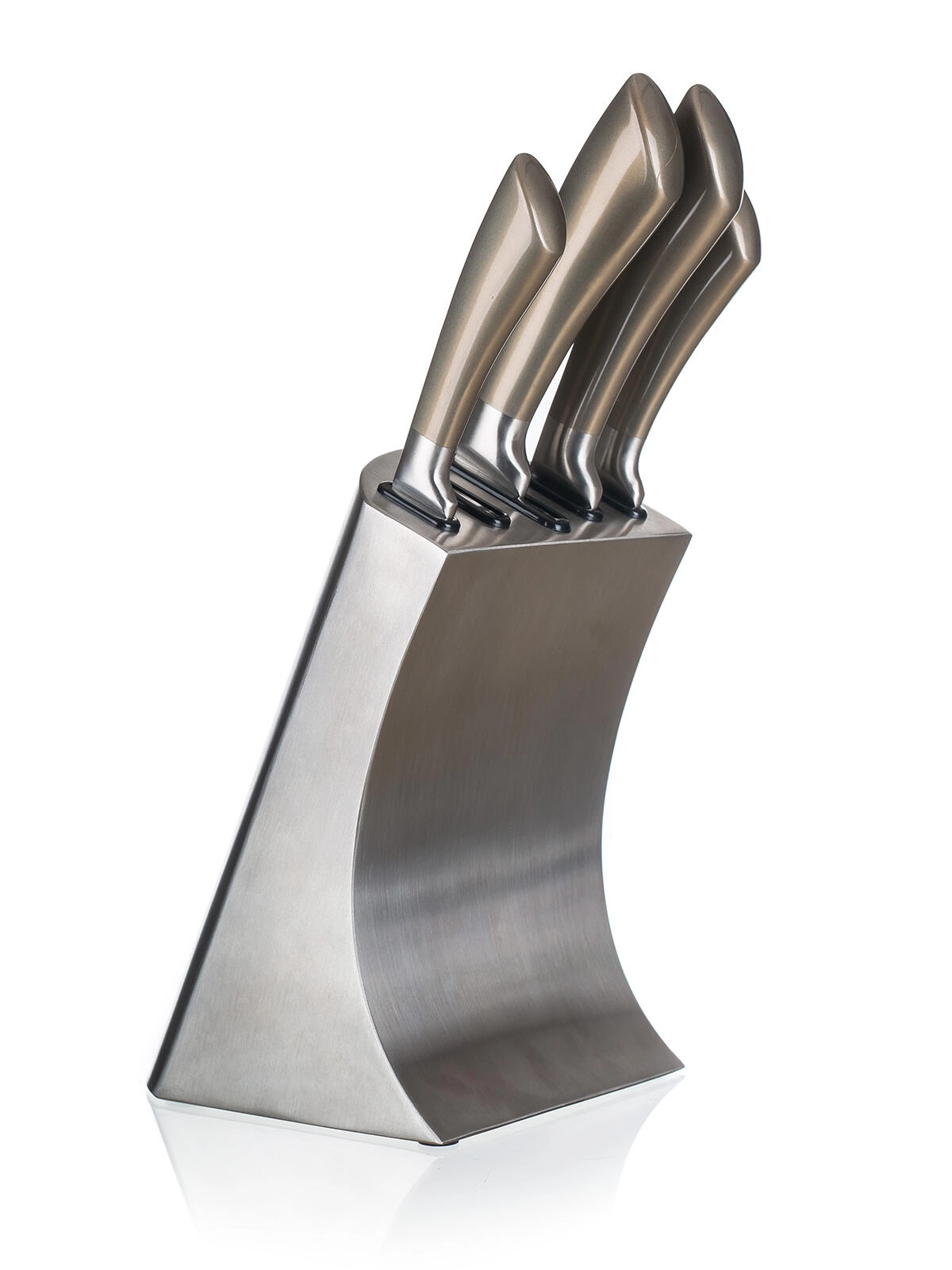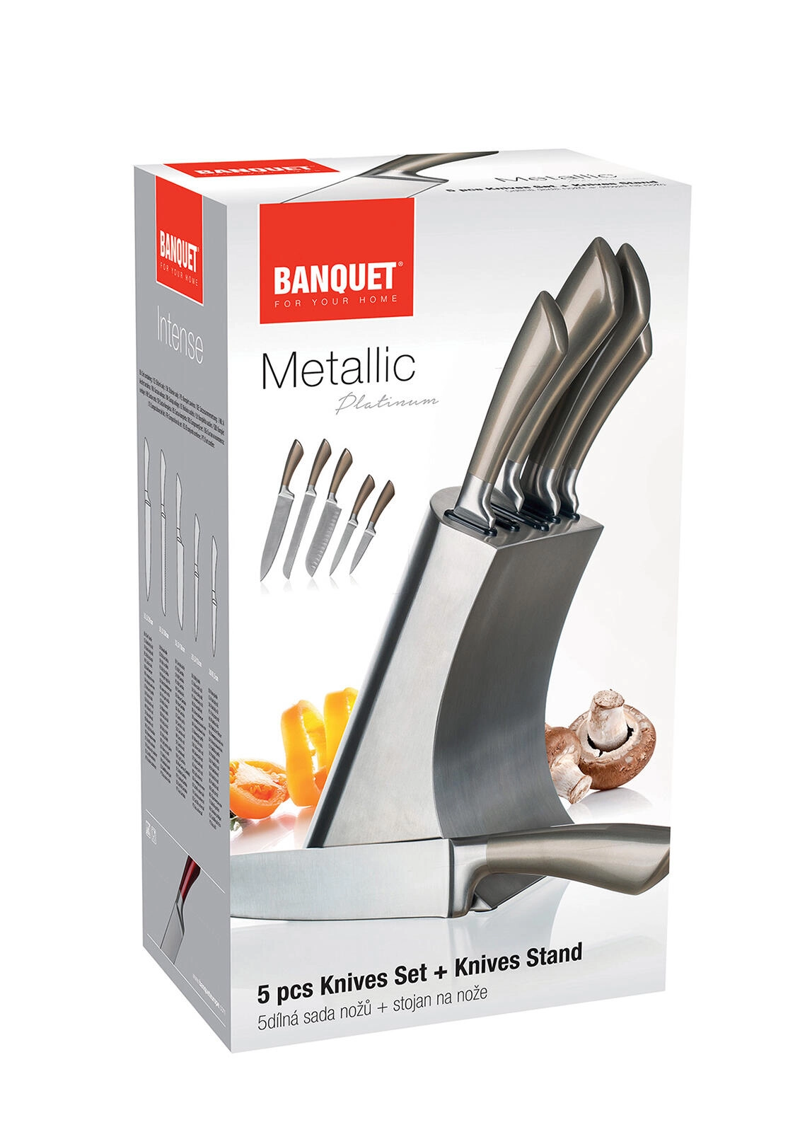 Le set METALLIC Platinum allie look moderne et fonctionnalité. Les couteaux en acier inoxydable offrent une netteté fiable et un entretien facile, tandis que le support métallique stable garde les lames en sécurité et à portée de main. Parfait pour toute cuisine où performance et design comptent.