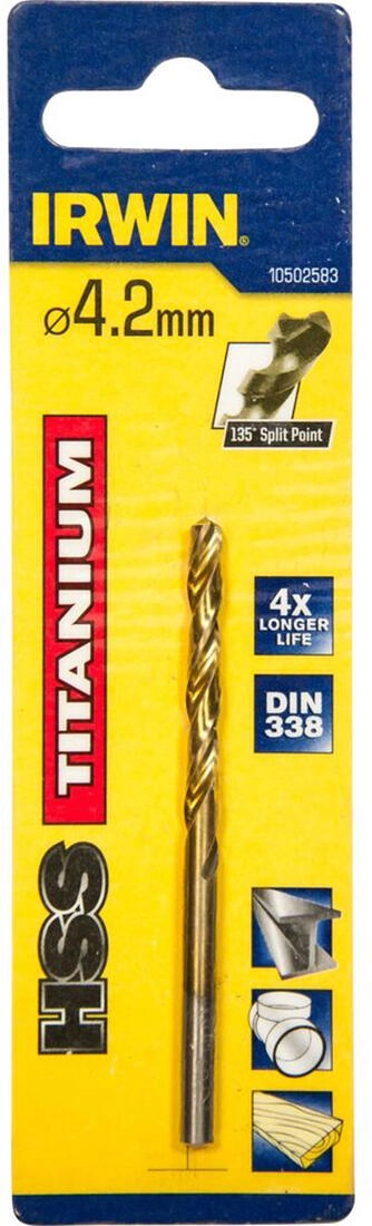Le foret IRWIN HSS TiN de diamètre 4,2 mm est conçu pour des conditions exigeantes et une productivité élevée. Le revêtement en nitrure de titane d’une dureté d’environ 80 HRC réduit significativement le frottement et l’échauffement, garantissant des trous propres, une durée de vie prolongée et des performances stables même à des vitesses plus élevées.