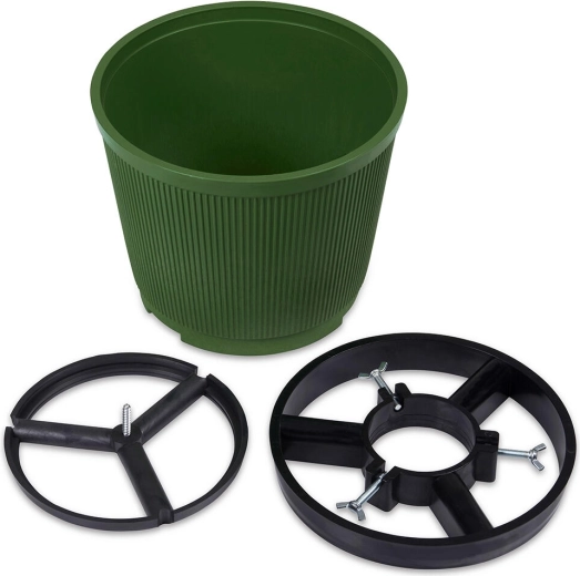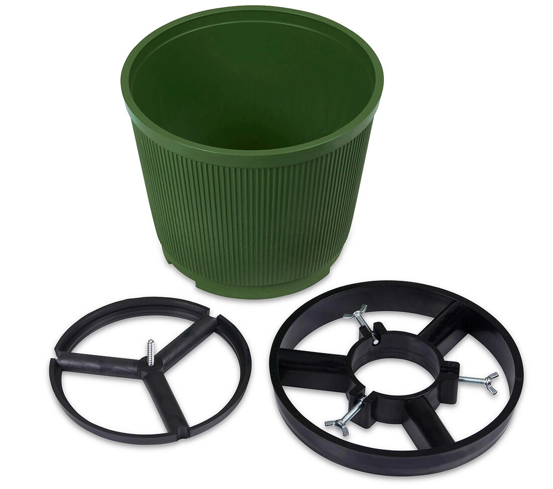 Un élément plastique amovible facilite le nettoyage et la manipulation. Pour une stabilité accrue, la base peut être remplie de sable et d’eau. Le support convient à une large gamme de diamètres de troncs grâce à sa grande ouverture de montage.