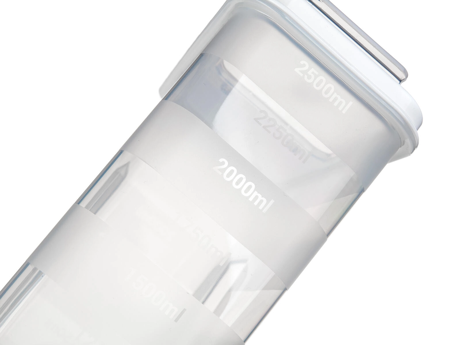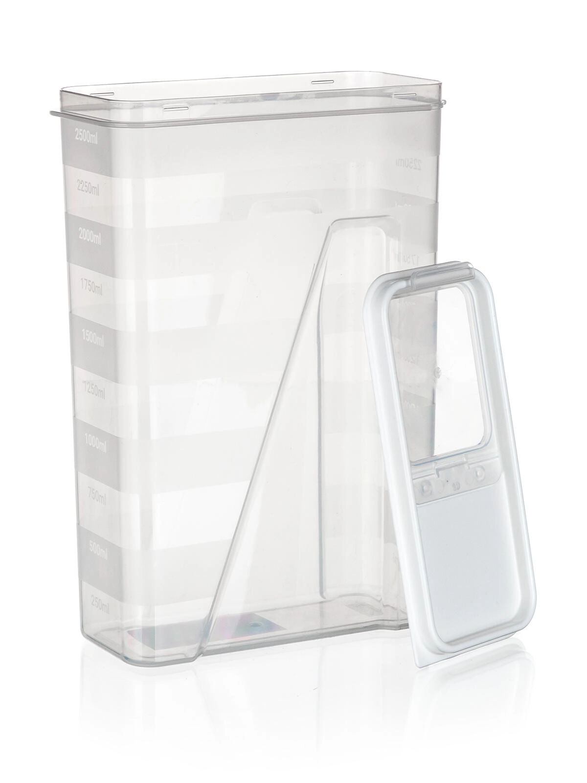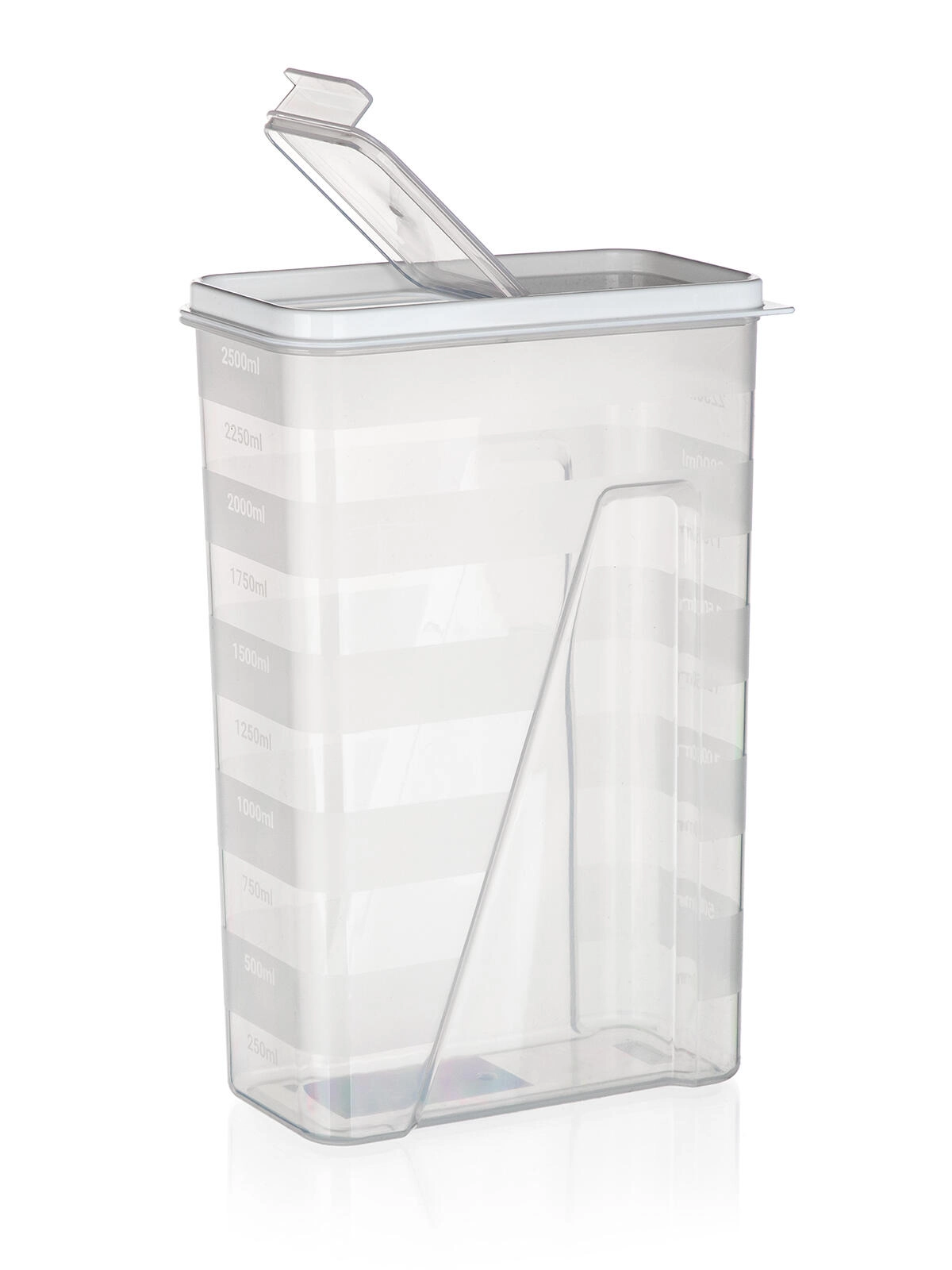 Pratique boîte de cuisine de 2,5 l avec couvercle doseur à ouverture pour un versement facile et un dosage précis. Corps transparent pour un contrôle immédiat du contenu et couvercle hermétique de couleur blanche pour garder les aliments frais plus longtemps. Idéale pour pâtes, légumineuses, farine, riz ou céréales, avec repères de mesure tous les 250 ml pour un portionnement pratique.