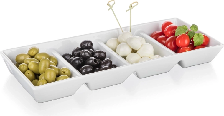 Quatre compartiments gardent les en-cas bien séparés – idéal pour les olives, la mozzarella, les tomates, les fruits à coque ou les dips. Aucune fusion des saveurs, une présentation nette.