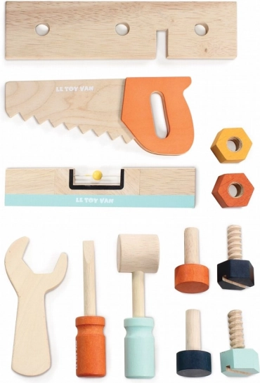 Scie, marteau, tournevis, clé, niveau à bulle, vis, boulons, clous et plaquette – des accessoires parfaitement adaptés aux petites mains.