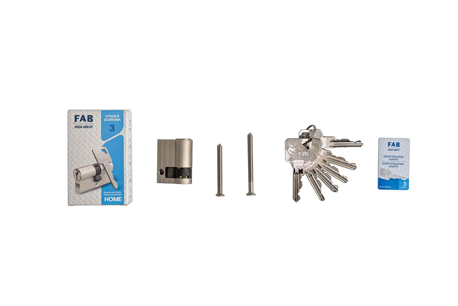 Cylindre de sécurité robuste FAB 3 HOME pour portes nécessitant un haut niveau de protection, offrant une protection contre le perçage, un système de verrouillage à 6 goupilles et une livraison avec 6 clés. Corps et rotor en laiton, profil paracentrique protégé par brevet et classe de sécurité 3 garantissent une protection fiable pour appartement, maison et bureau.