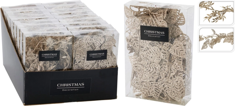 Élégante guirlande à feuilles de 180 cm, remarquable par sa couleur dorée et son effet scintillant, qui crée une ambiance festive dans tout intérieur. Disponible en mélange de 2 variantes pour s’accorder facilement avec votre décoration.
