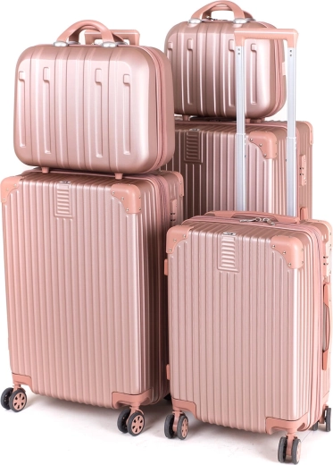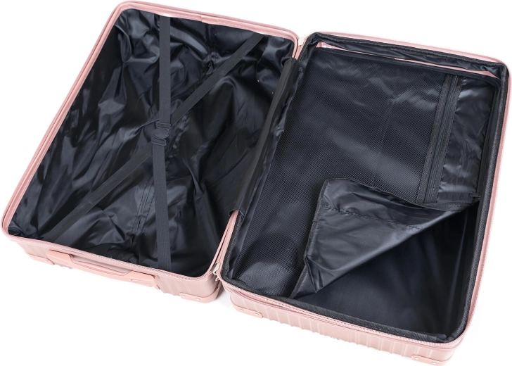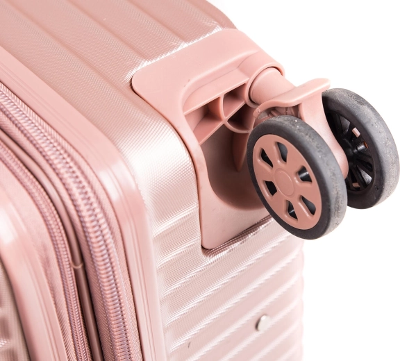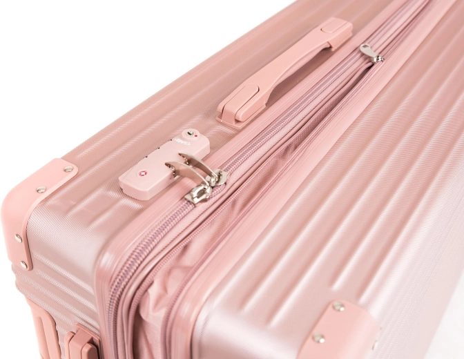 Élégante valise rigide rose doré au format L offrant un volume de 86 l, une structure ABS résistante et quatre doubles roulettes à 360° pour une manipulation aisée. Grâce au cadenas à code TSA, à l’extenseur et à un intérieur bien pensé, elle est le choix idéal pour voyager confortablement.