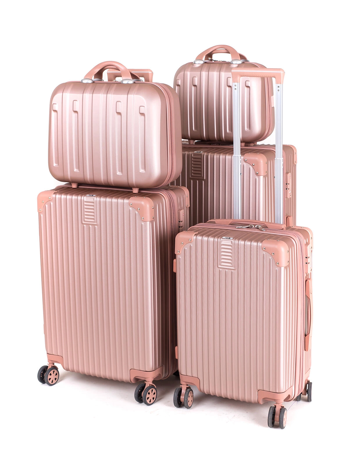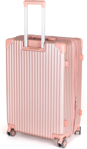 Cette valise de voyage spacieuse allie style et fonctionnalité. La coque ABS rigide avec coins renforcés protège efficacement vos affaires, tandis que la poignée télescopique verrouillable et 4 doubles roulettes pivotantes garantissent un déplacement fluide et stable dans toutes les directions. La finition métallique rose apporte une touche d’élégance à vos voyages.