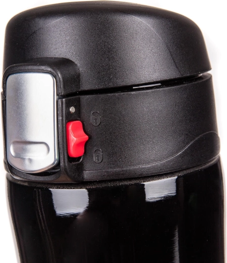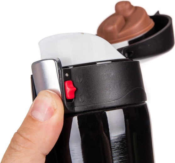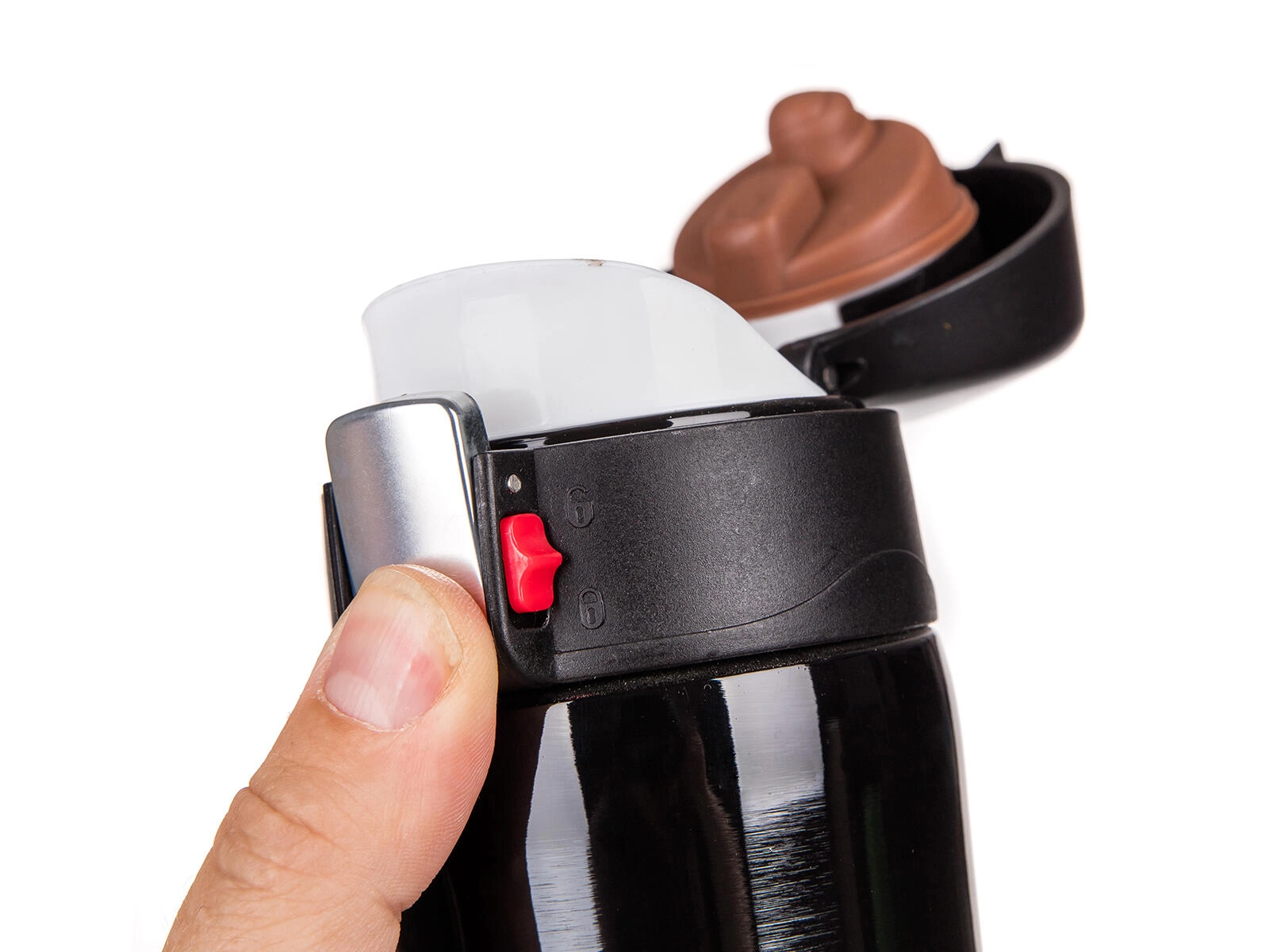 Le couvercle flip‑top s’ouvre par simple pression sur un bouton et est sécurisé par un verrou coulissant empêchant toute ouverture accidentelle dans un sac ou un sac à dos.