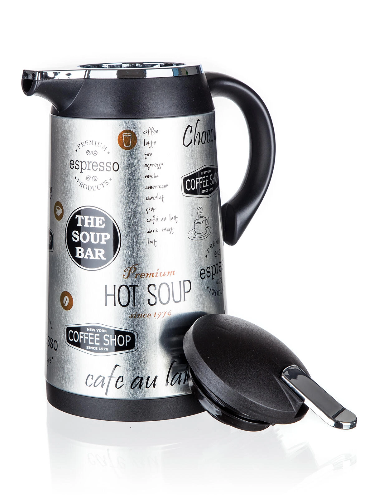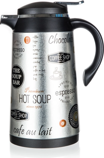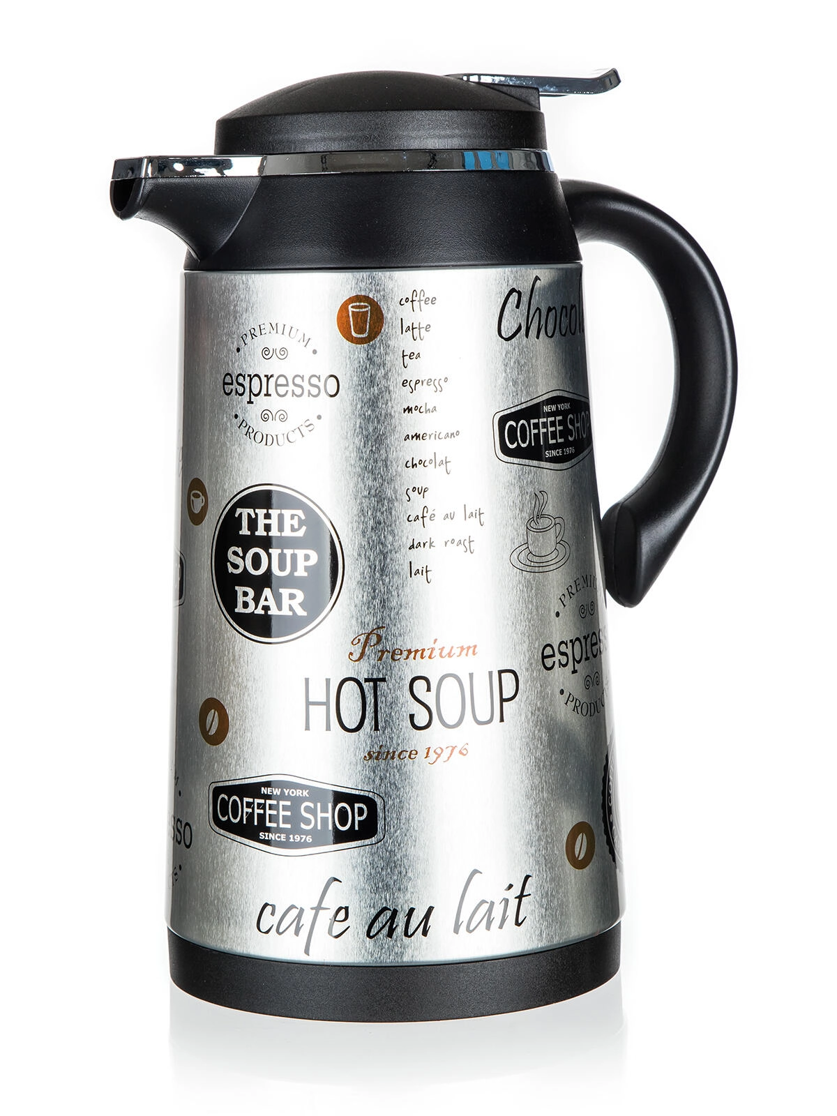 La carafe isotherme CONTE allie praticité et design moderne. Grâce à son ampoule isolante en verre, le café, le thé ou les limonades froides conservent leur température longtemps. Son revêtement en acier inoxydable avec imprimé décoratif apporte robustesse et élégance, tandis que la poignée ergonomique en plastique PP garantit un service confortable et sûr.