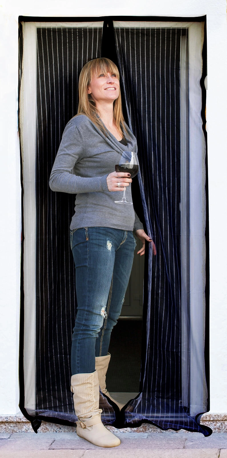 Les deux panneaux de la moustiquaire se rejoignent d’eux-mêmes après le passage. De puissants aimants sur toute la hauteur garantissent que les insectes restent dehors tandis que l’air circule à l’intérieur.