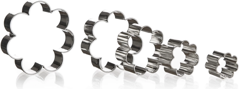 Découvrez un set universel d’emporte-pièces en forme de fleur, idéal pour sablés, pain d’épices, biscuits et décoration de gâteaux. Grâce à cinq tailles différentes, vous créerez des ensembles de formes parfaitement assortis, du mini aux motifs plus grands. La tôle étamée résistante assure une découpe nette et un entretien facile.