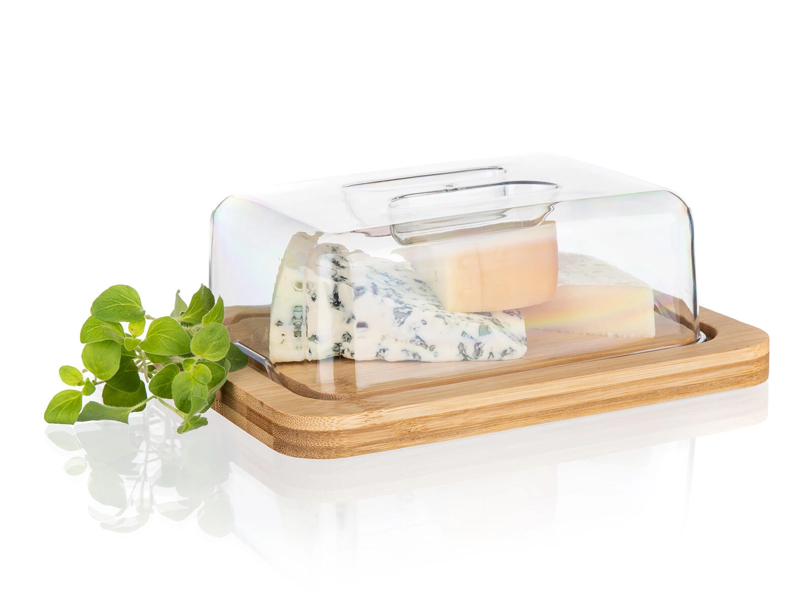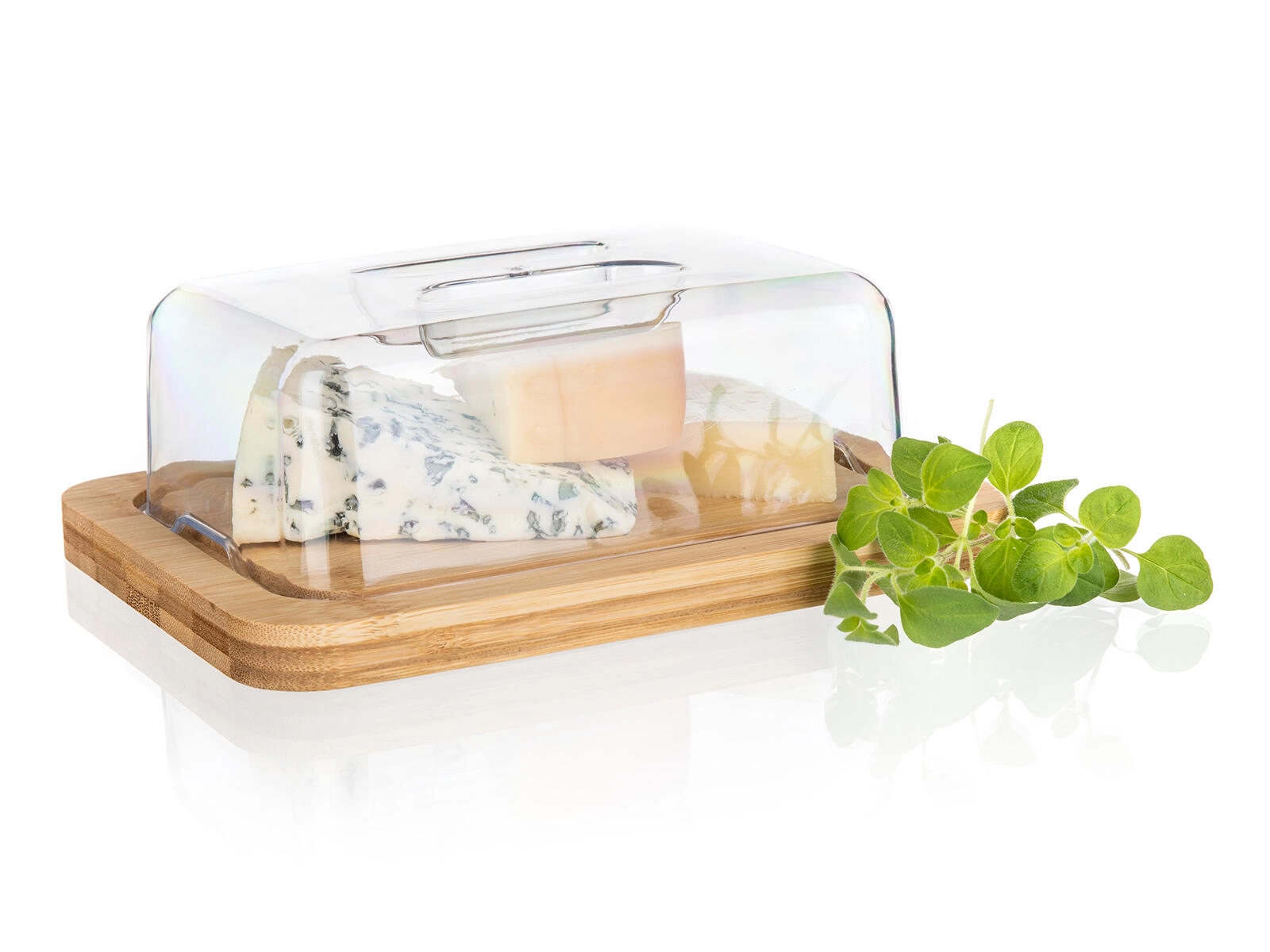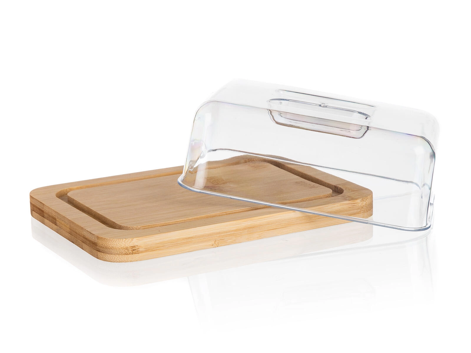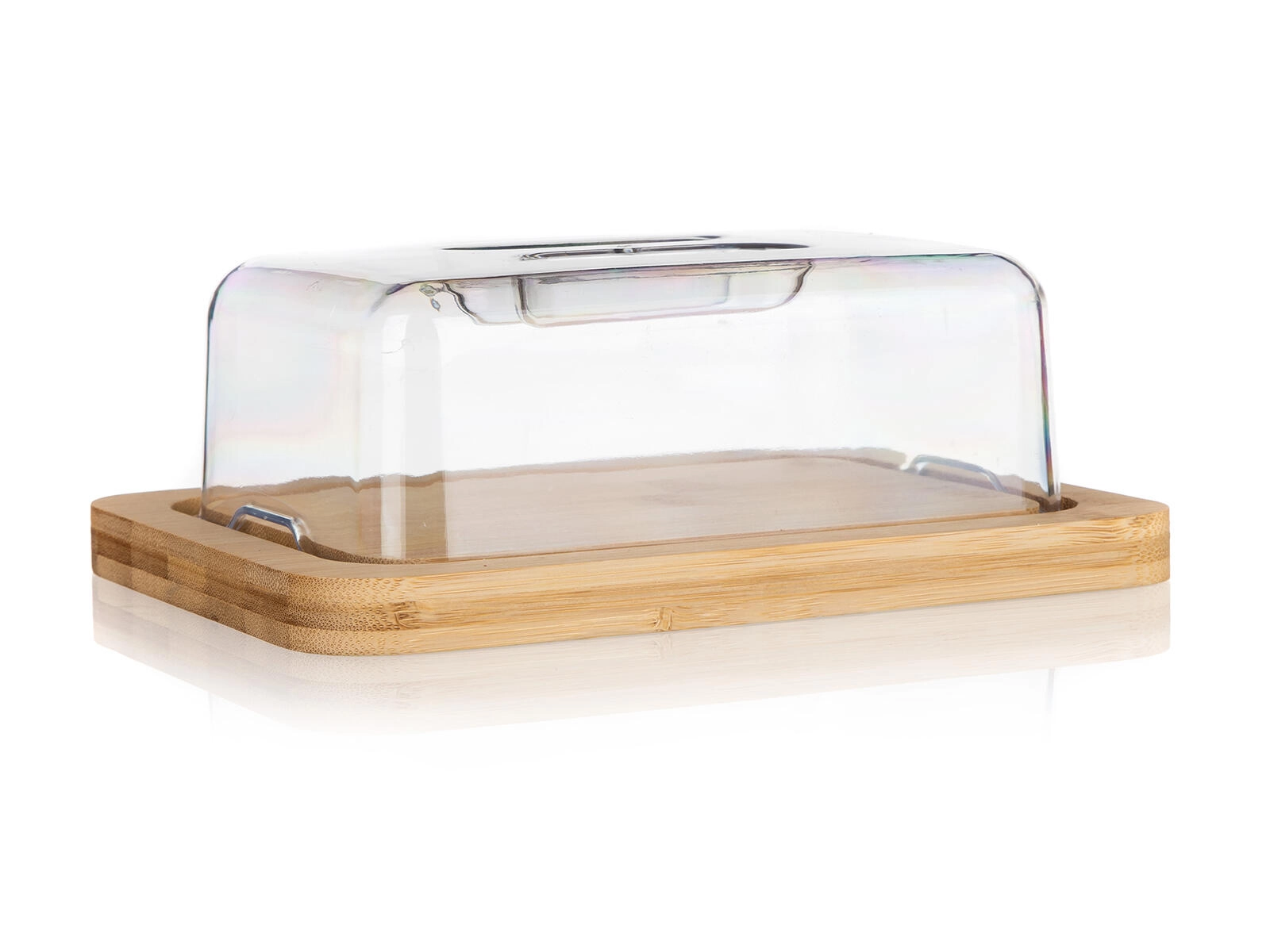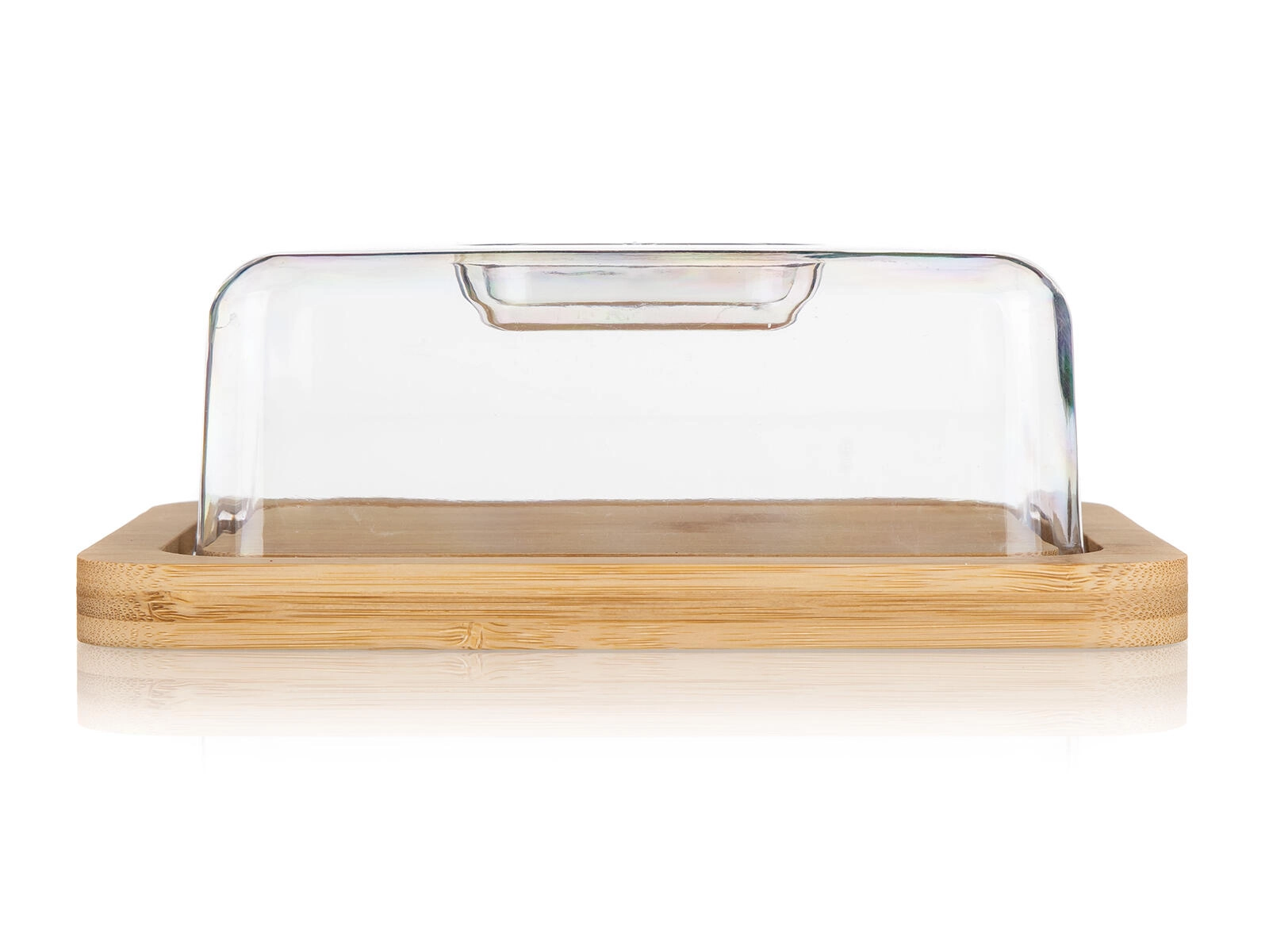 Ce beurrier stylé associe le bois de bambou naturel à un couvercle en acrylique résistant, qui protège le contenu du dessèchement, des odeurs et des impuretés. Le couvercle transparent permet de vérifier immédiatement le contenu, tandis que la base en bois solide sert également de planche de service.