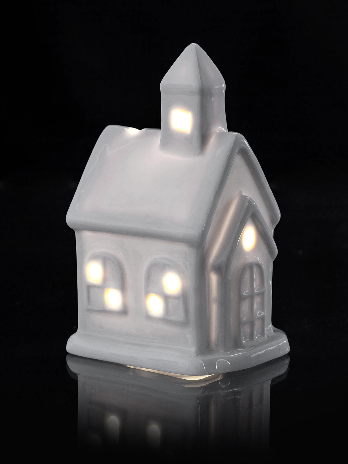 Élégante petite maison en porcelaine avec éclairage LED blanc, créant une atmosphère chaleureuse et une lumière vacillante type bougie. Idéale pour le salon, la chambre ou les décorations festives. Piles et ampoule LED incluses pour une utilisation immédiate.