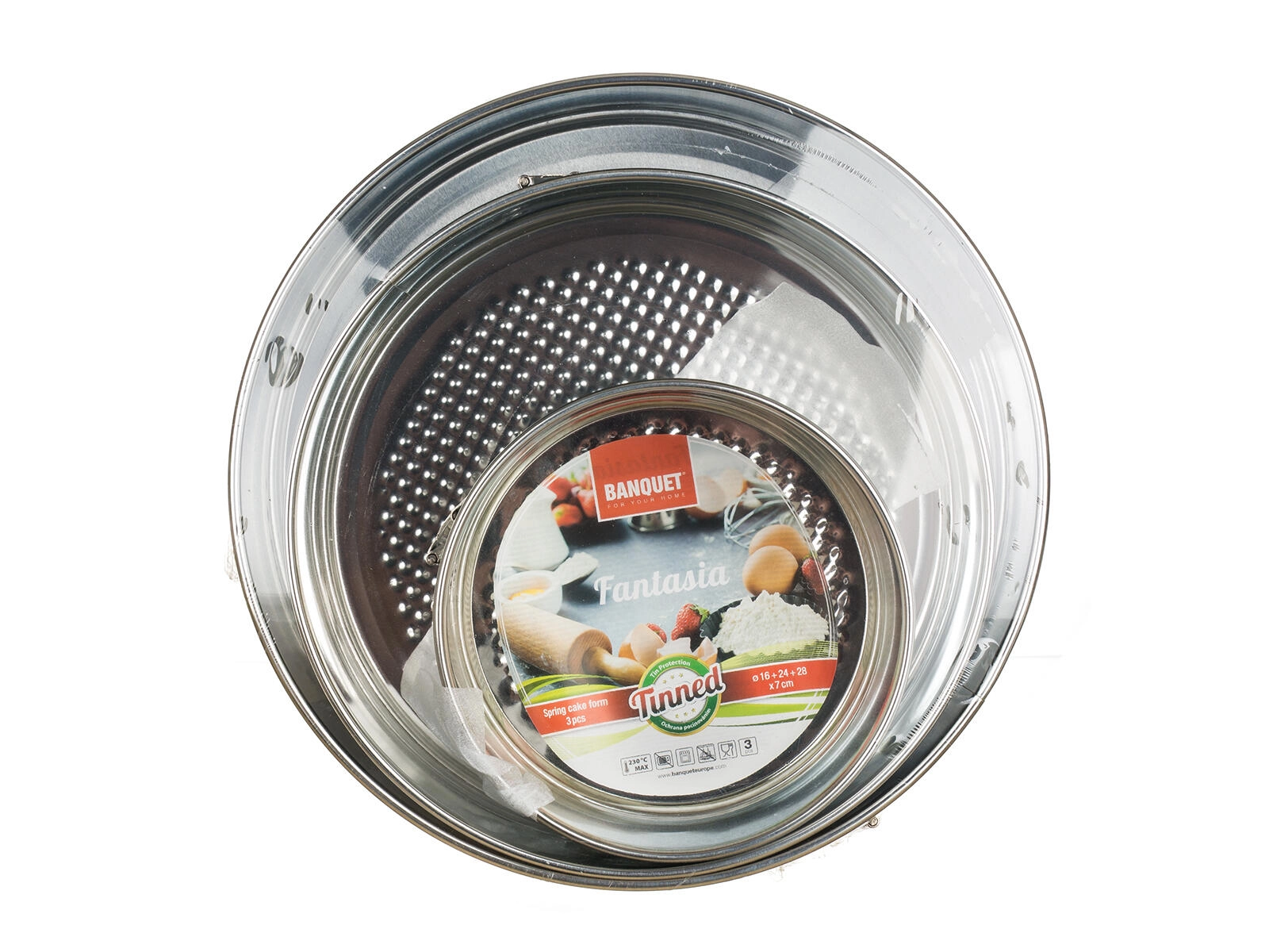 Le set comprend les diamètres 16 cm, 24 cm et 28 cm, tous d’une hauteur de 7 cm, afin de toujours choisir la taille idéale. Les moules conviennent aux fours électriques, à gaz et à convection, ne passent pas au lave-vaisselle ni au micro-ondes.