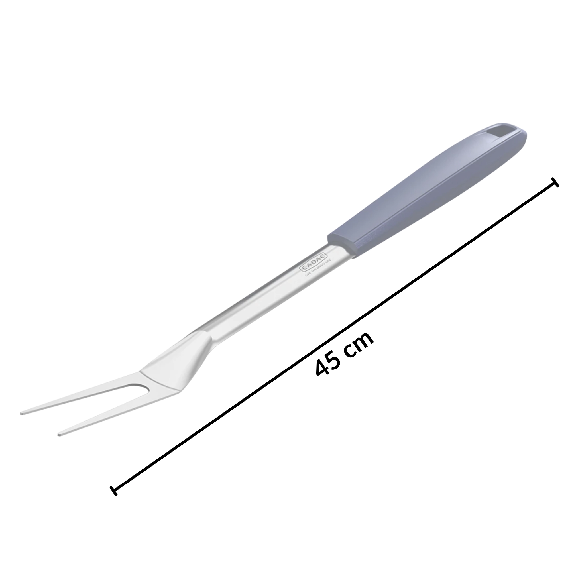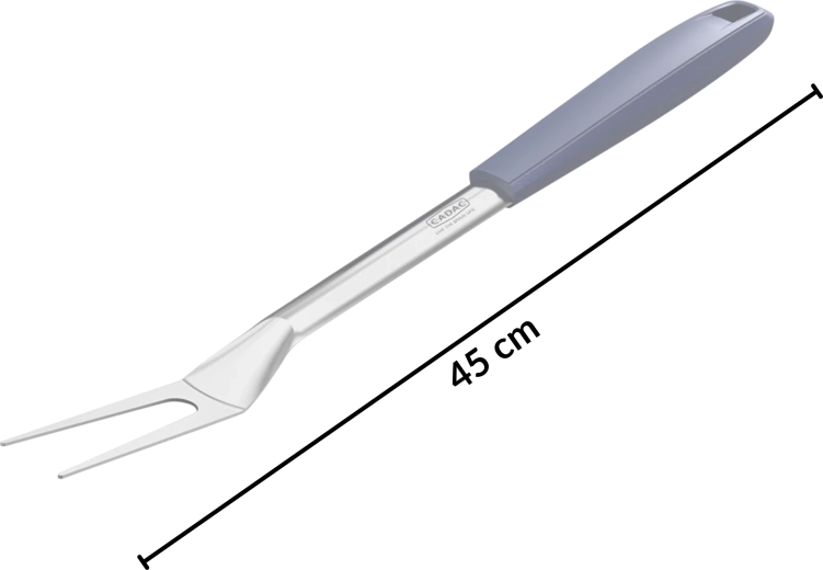 Le set CADAC combine l’acier inoxydable pour les parties de travail et un plastique résistant à la chaleur pour les poignées. Les ustensiles longs (45 cm) offrent assurance et distance suffisante de la chaleur, tandis que les embouts magnétiques permettent un dépôt rapide sur une surface métallique (sauf inox). Les supports intégrés maintiennent les pointes au‑dessus du plan de travail et évitent le contact avec les saletés.