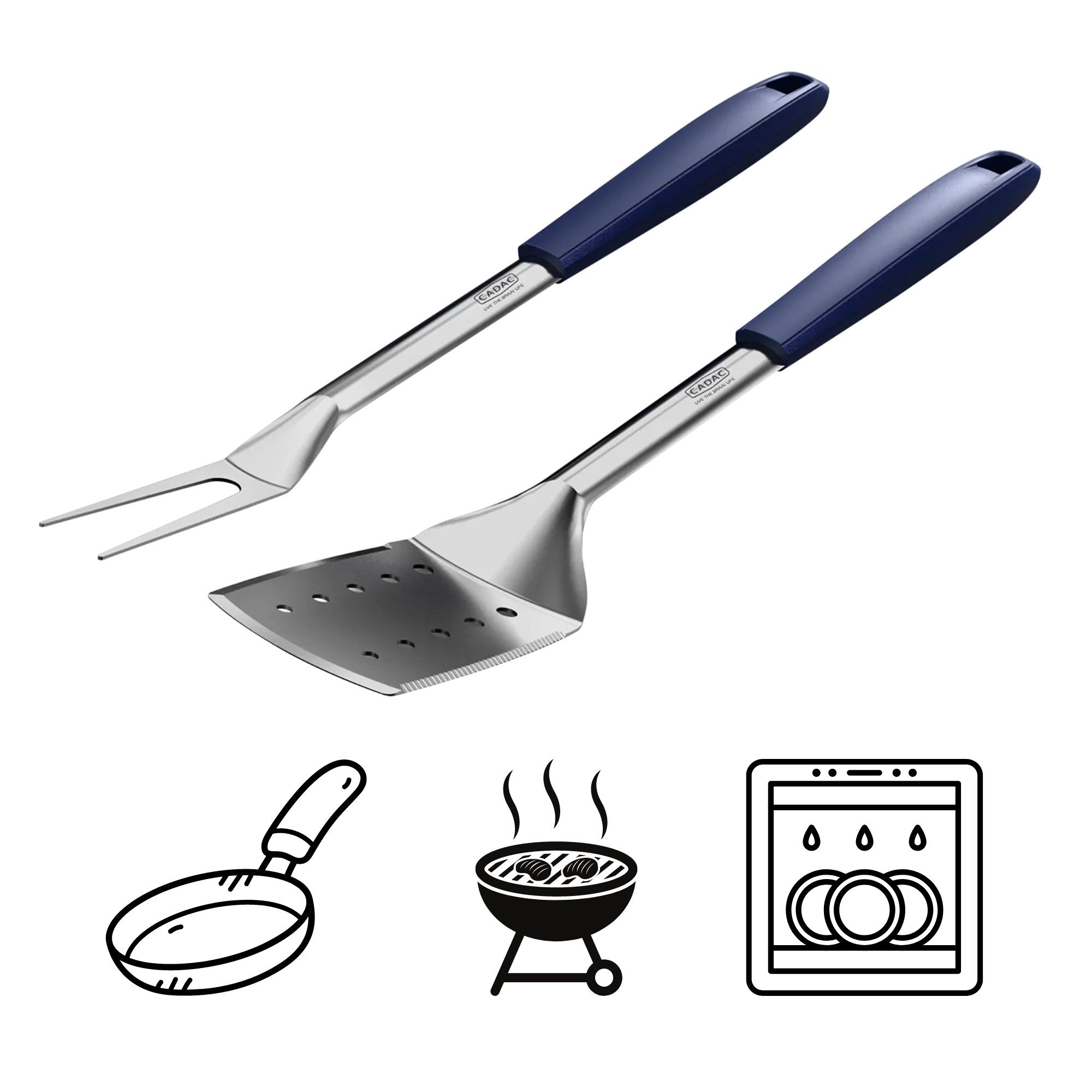La spatule à tête élargie est idéale pour retourner steaks, poissons ou burgers, tandis que la fourchette facilite le piquage et le transfert de la viande. Grâce à leur construction robuste et à leur ergonomie soignée, ce set est un excellent choix pour le barbecue au jardin comme pour la cuisine quotidienne.