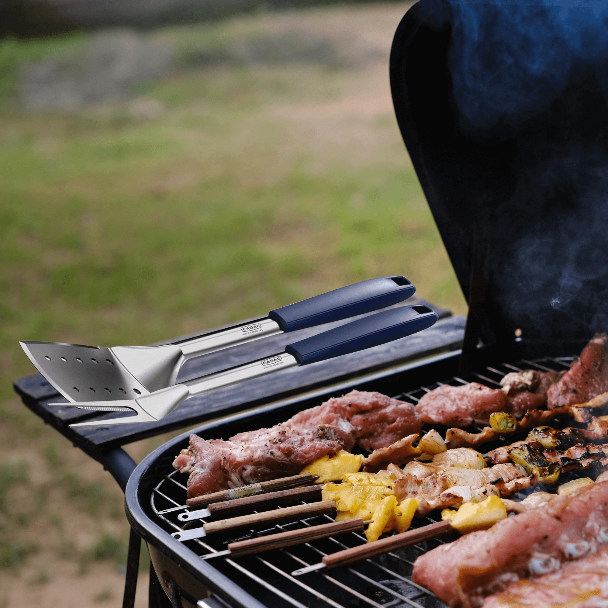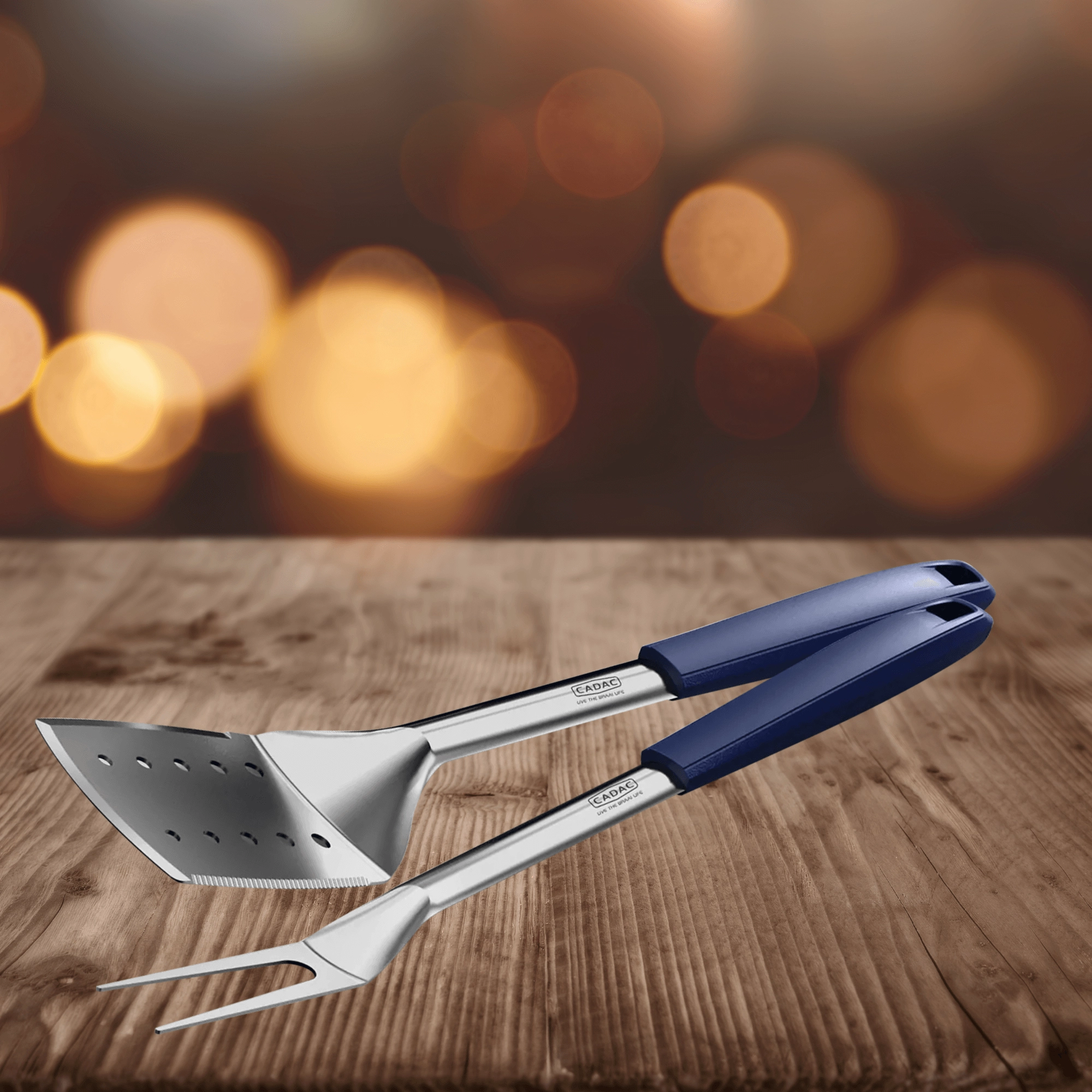 L’ensemble professionnel de barbecue CADAC comprend une robuste spatule et une fourchette en acier inoxydable, dotées de longues poignées ergonomiques. Grâce aux aimants intégrés dans les poignées, vous pouvez les fixer facilement sur la plupart des surfaces métalliques, tandis que les supports intégrés maintiennent les parties de travail au‑dessus de la table pour une meilleure hygiène. Des matériaux durables supportent les hautes températures et offrent une manipulation confortable et sûre, au grill comme en cuisine.