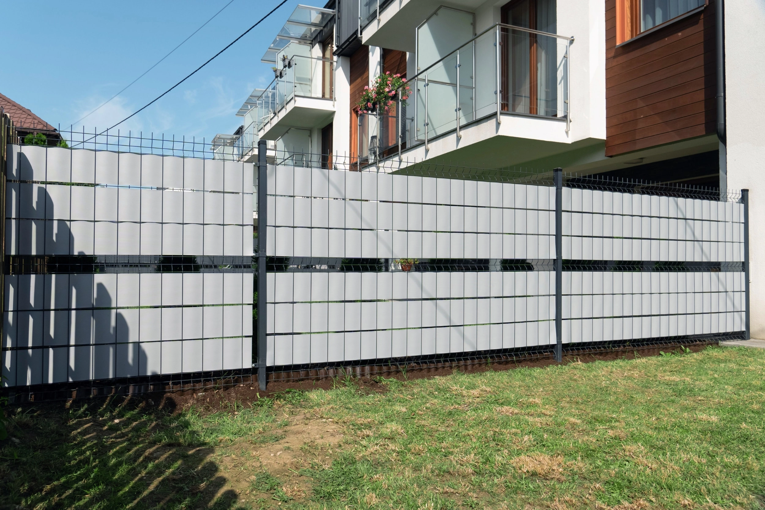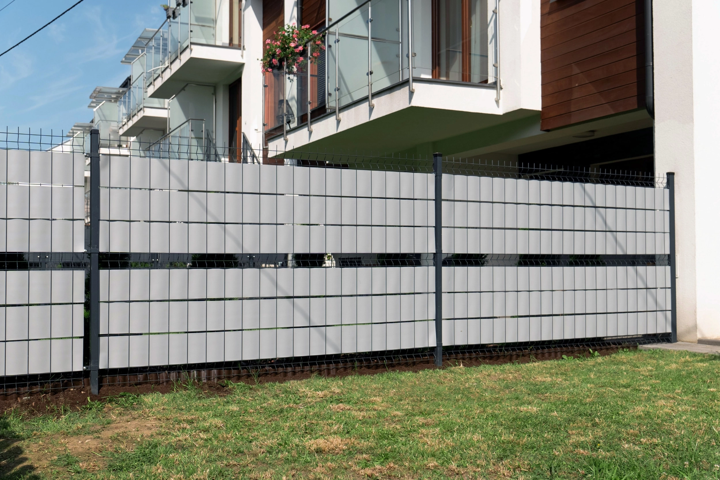 Bande de clôture de haute qualité en polypropylène (PP) pour un respect total de la vie privée et une protection contre le vent. Grâce à la 3S Technology, elle est stabilisée UV, résistante au gel et conserve sa couleur RAL 7040 – gris clair. Installation facile sans outils spéciaux, possibilité de pose sans clips. Garantie 10 ans.