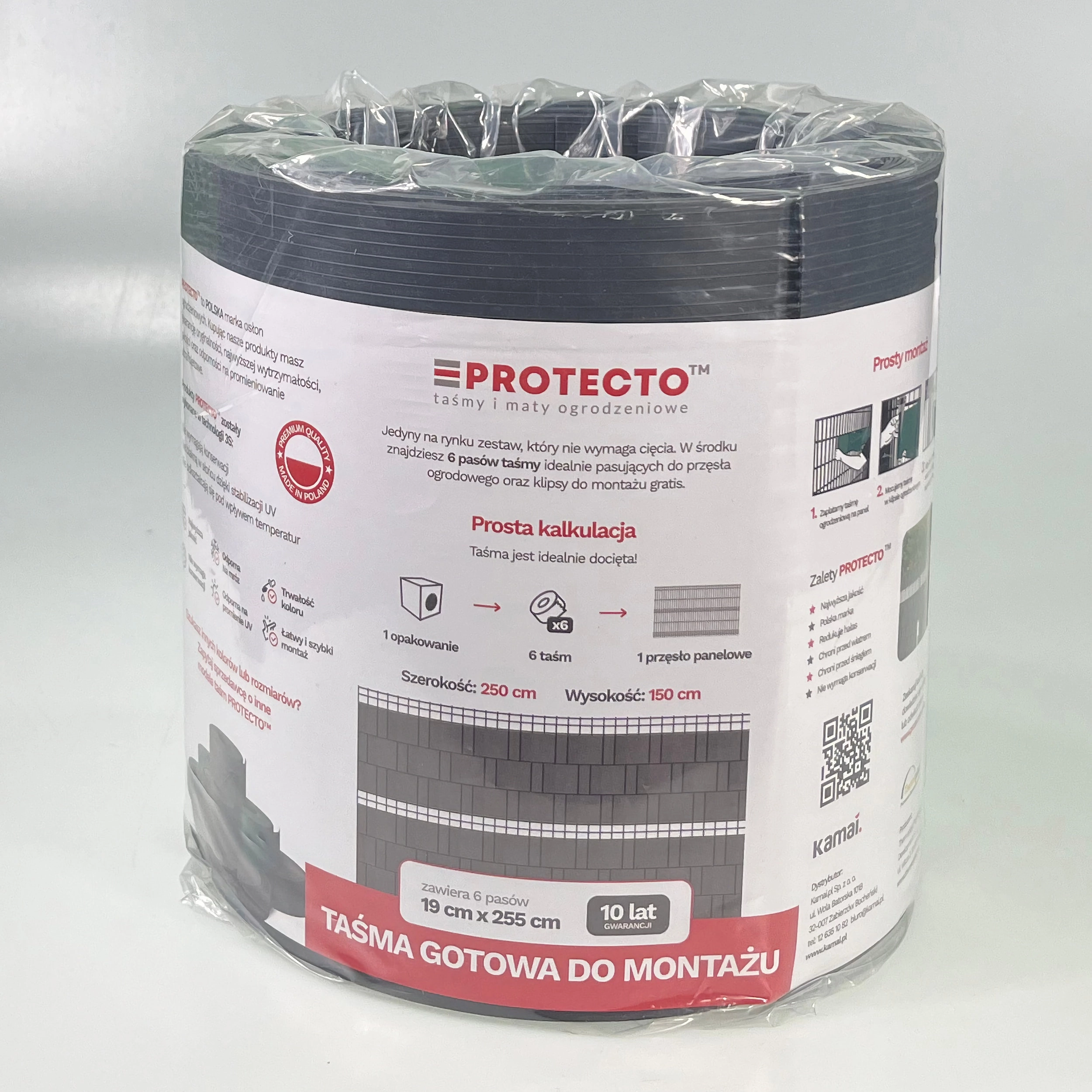 Bande pratique et pré-découpée en PP de qualité, longueur 2,55 m et largeur 19 cm, en teinte RAL 7016 graphite, offrant 100 % d’intimité, une installation rapide sans mesure ni découpe et une longue durée de vie avec protection UV. De plus, vous recevez 2 clips offerts pour une finition facile à chaque bande.
