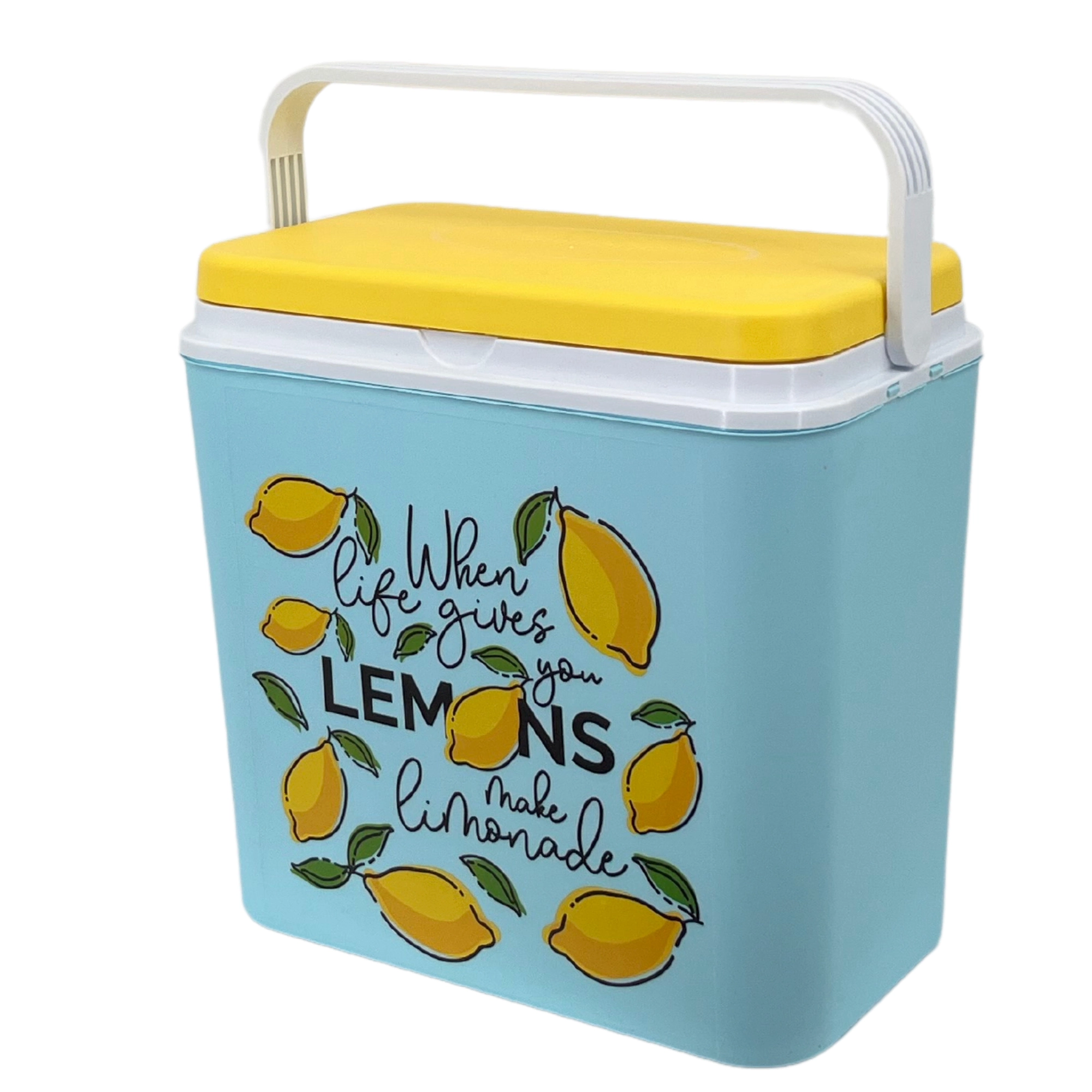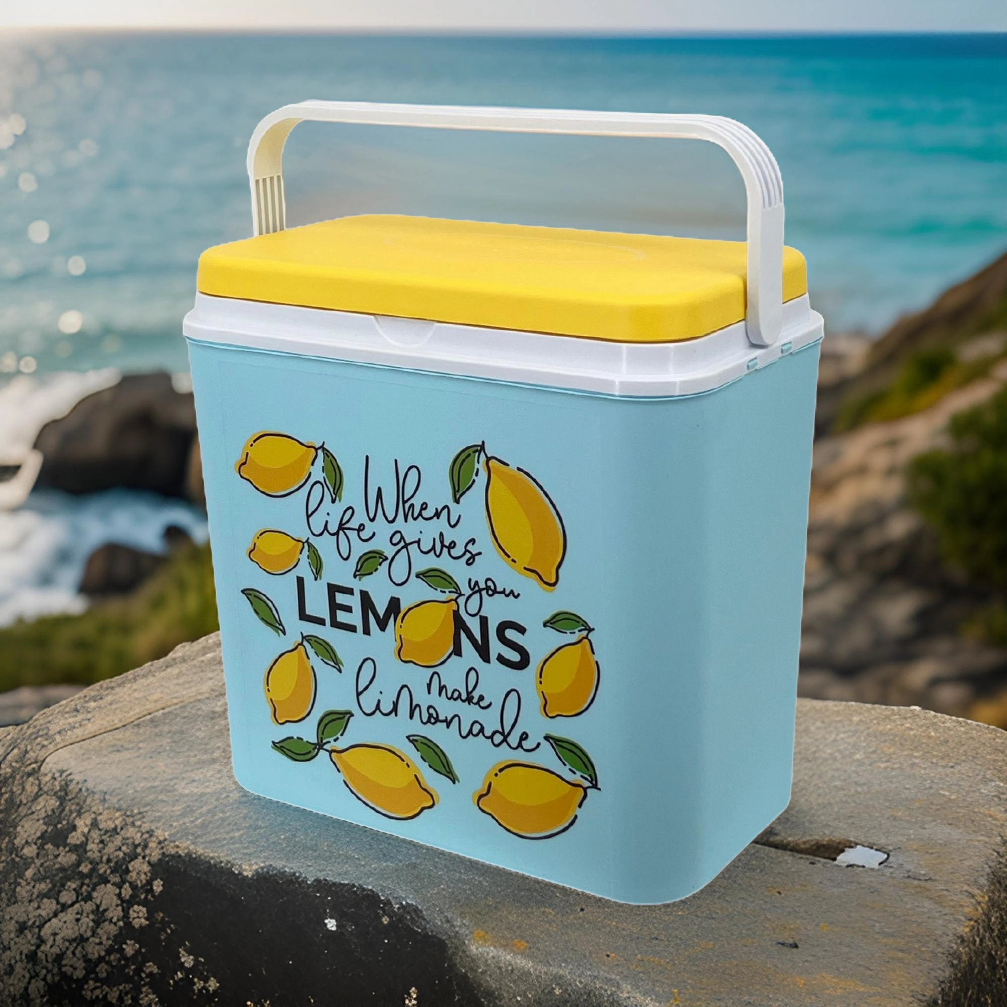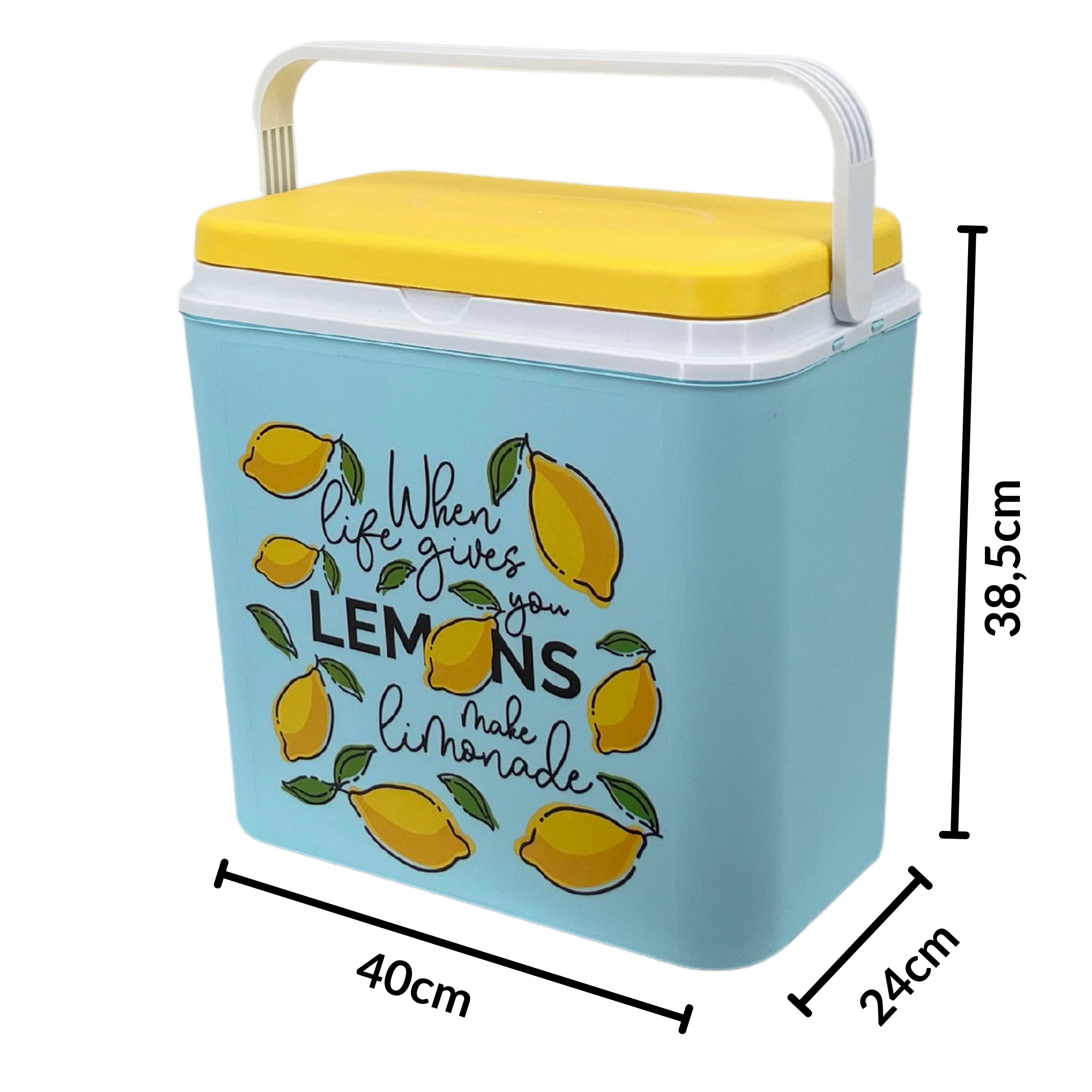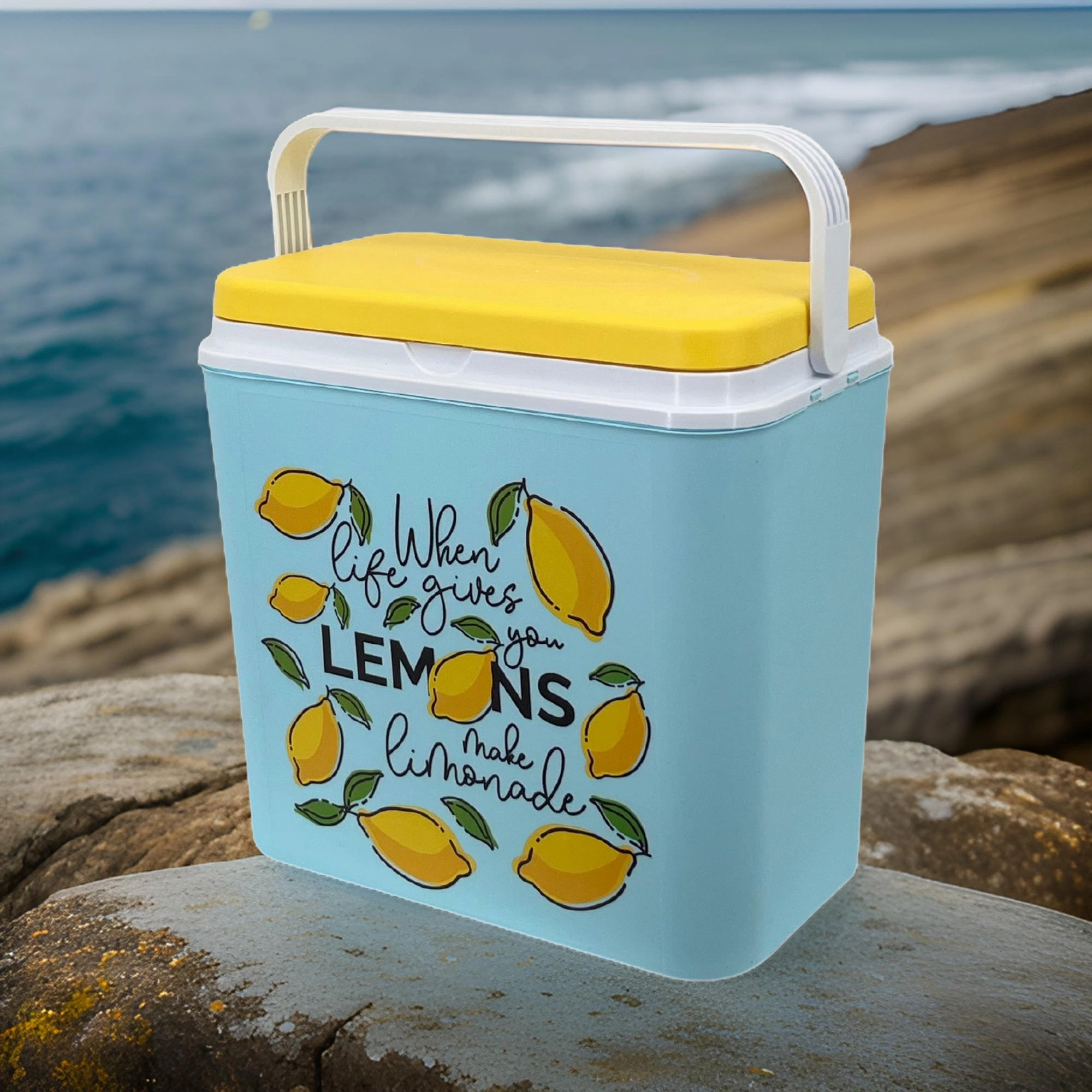 Cette glacière passive stylée séduit par son motif LEMONADE associant bleu clair et jaune. Grâce à son isolation bien pensée, elle maintient une basse température même par temps chaud et est idéale pour les sorties en famille, la plage et les pique-niques.