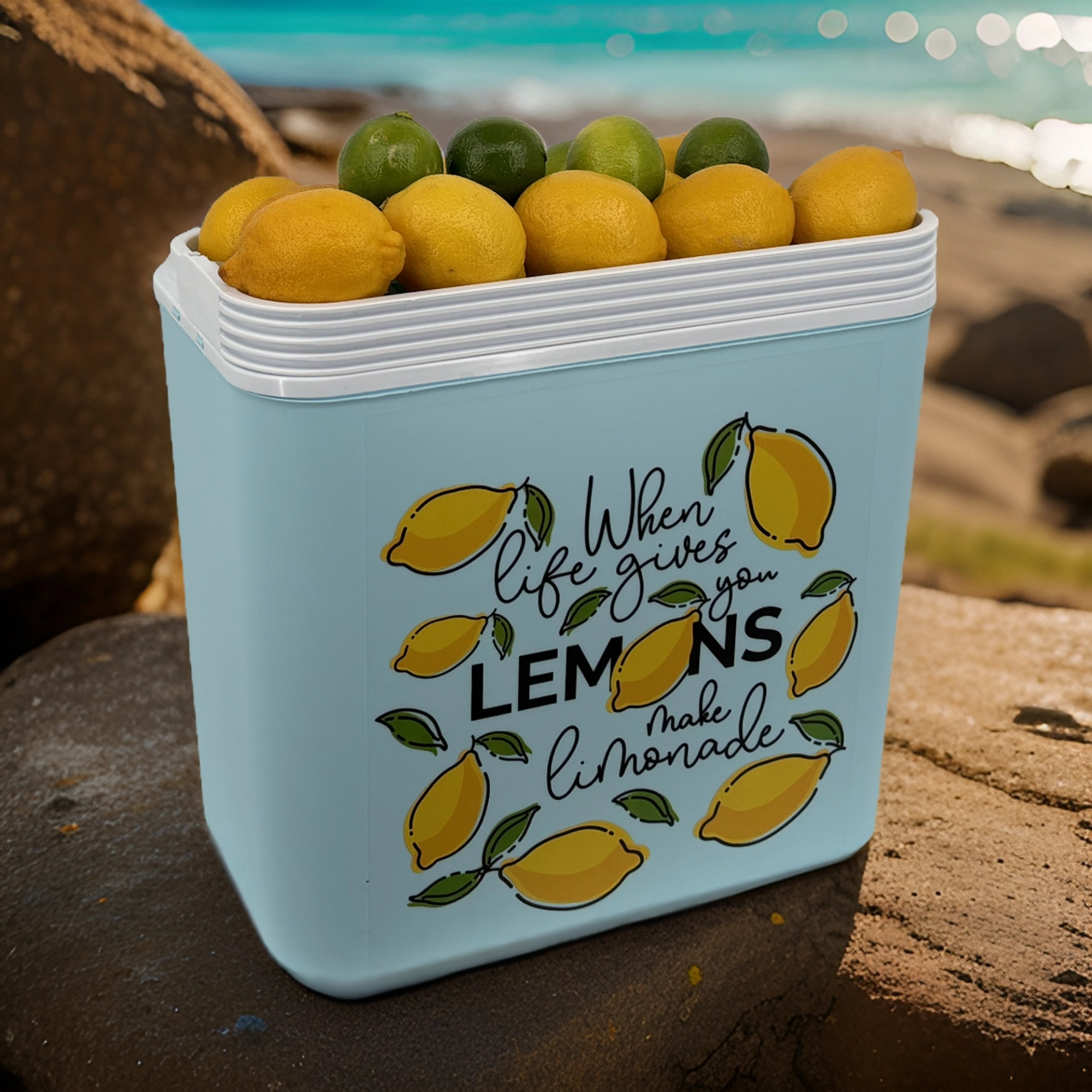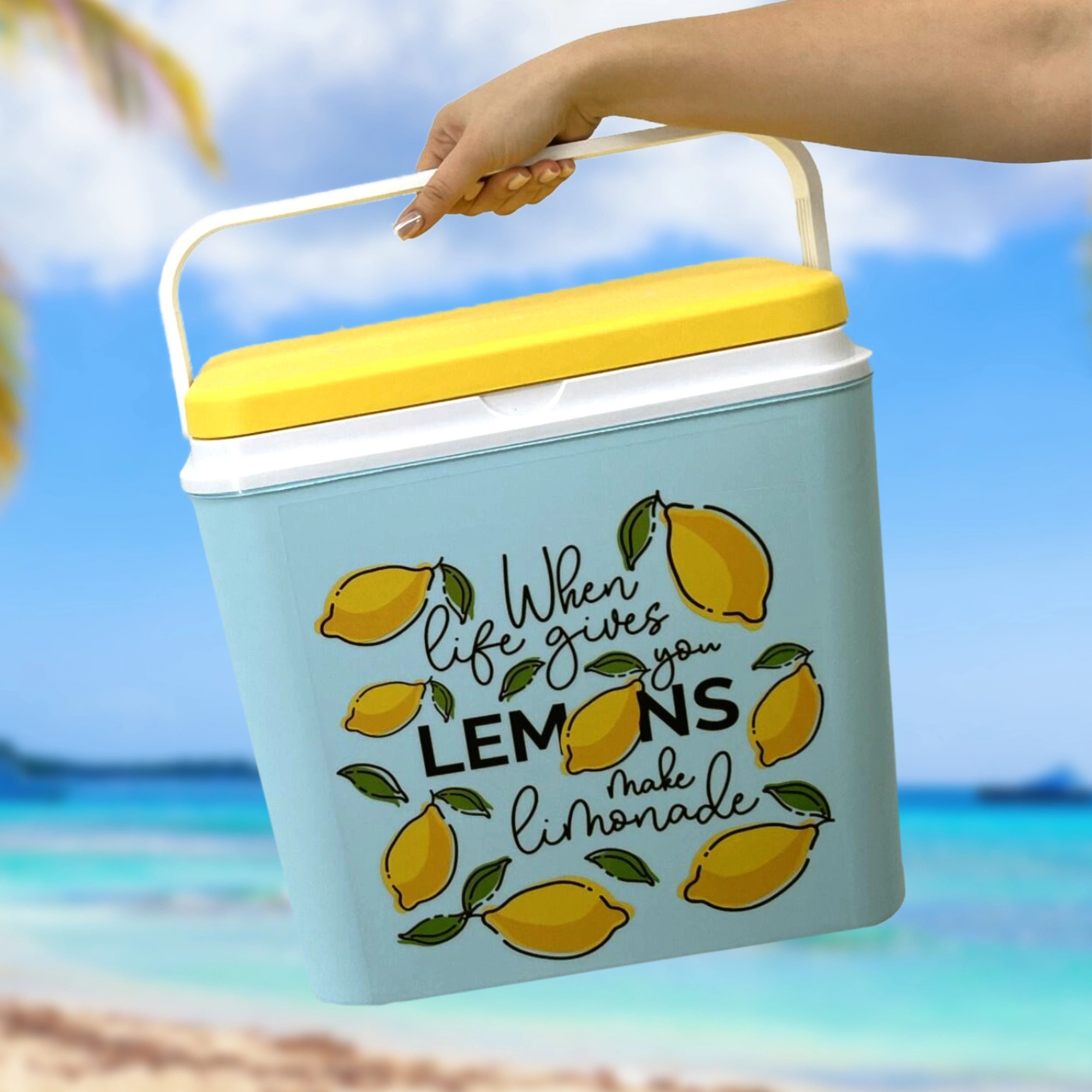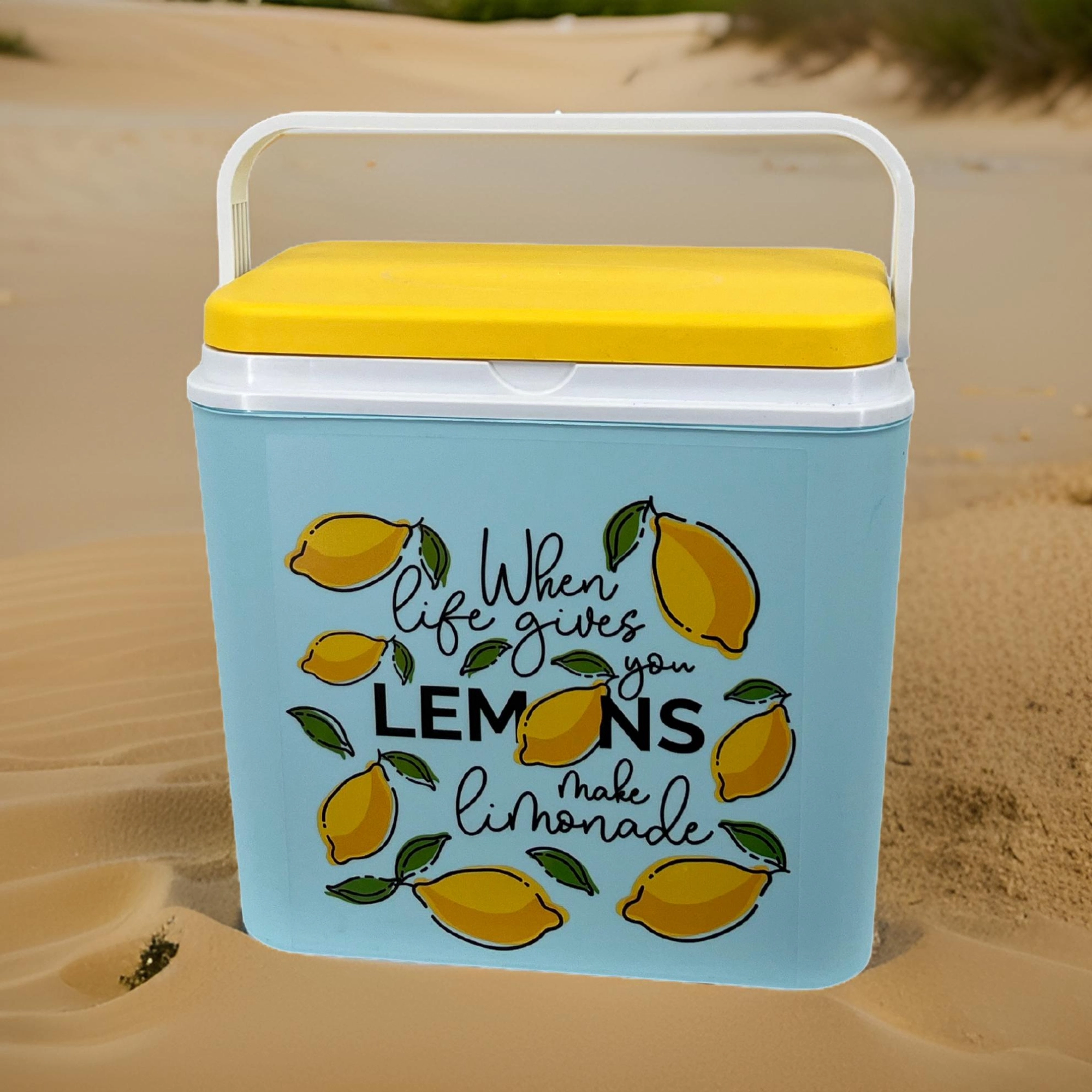 Cette glacière passive stylée séduit par son motif LEMONADE associant bleu clair et jaune. Grâce à son isolation bien pensée, elle maintient une basse température même par temps chaud et est idéale pour les sorties en famille, la plage et les pique-niques.