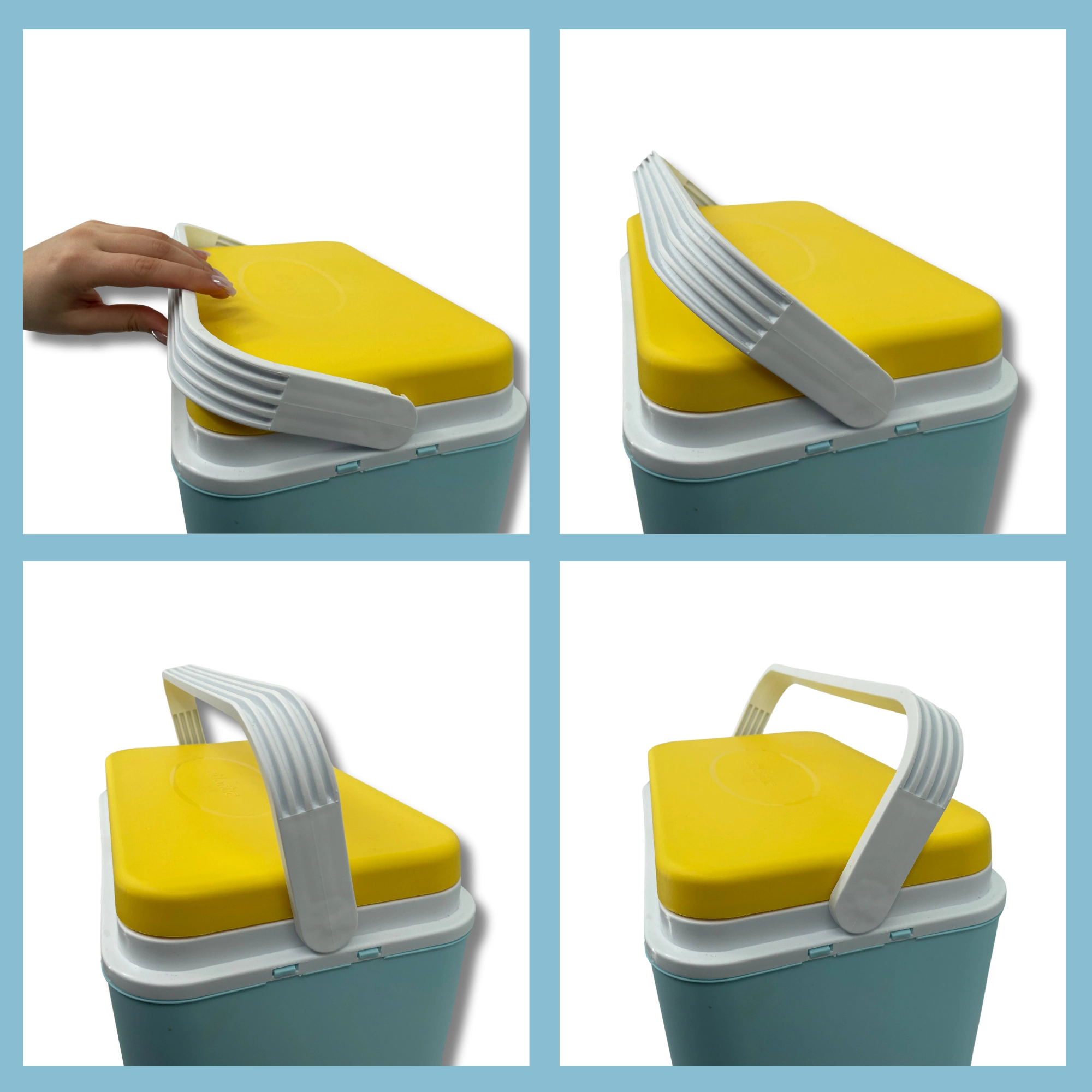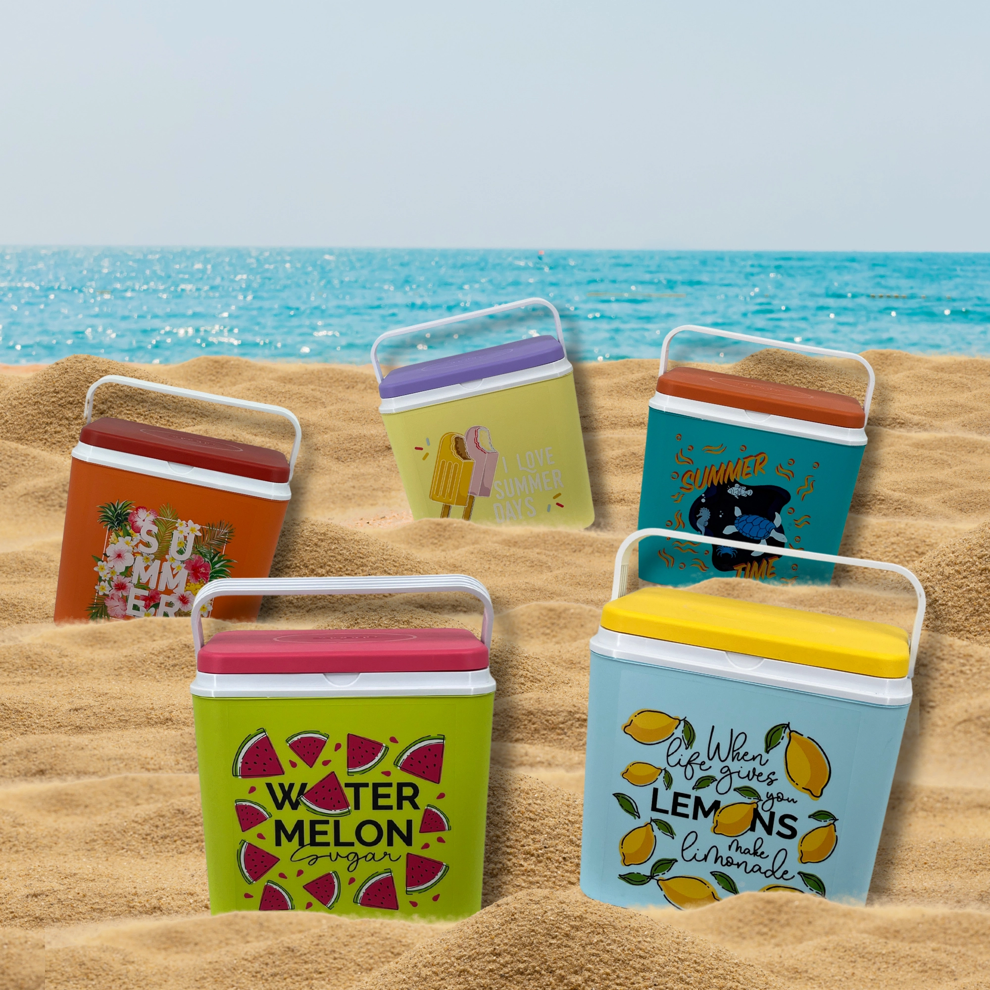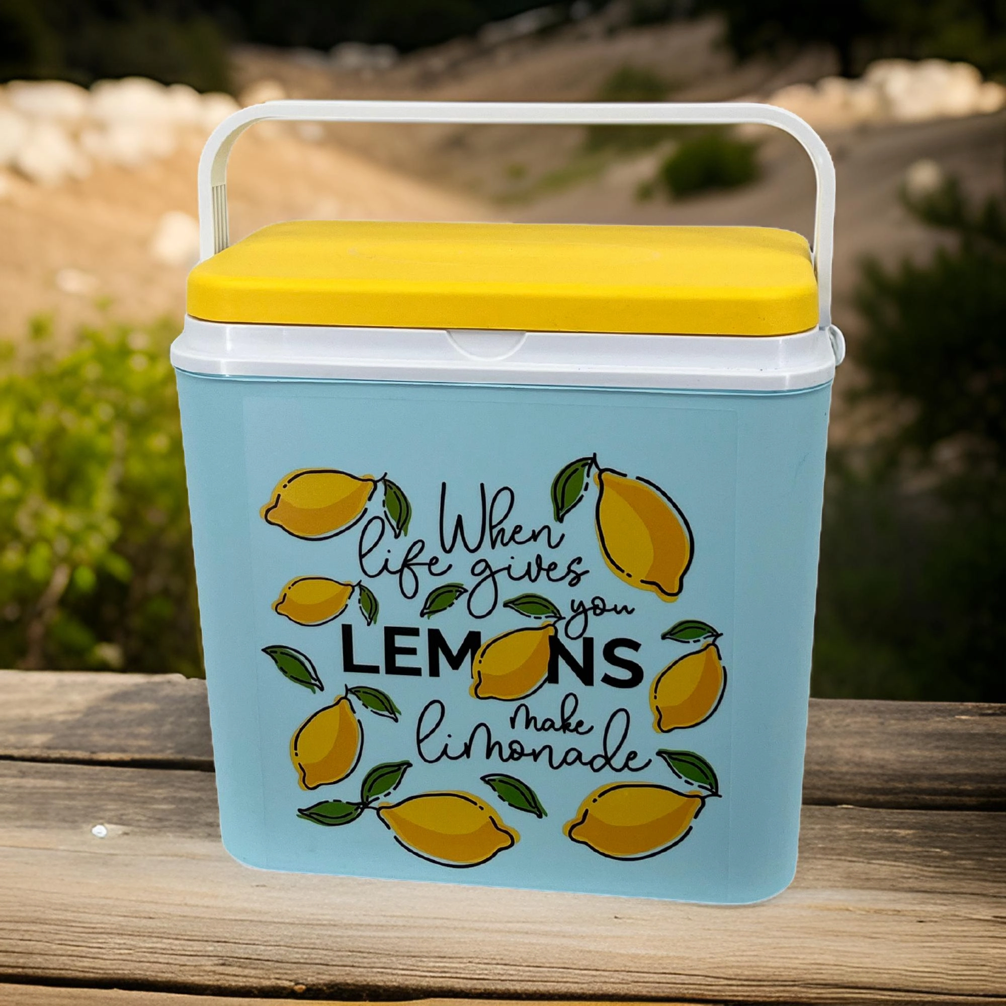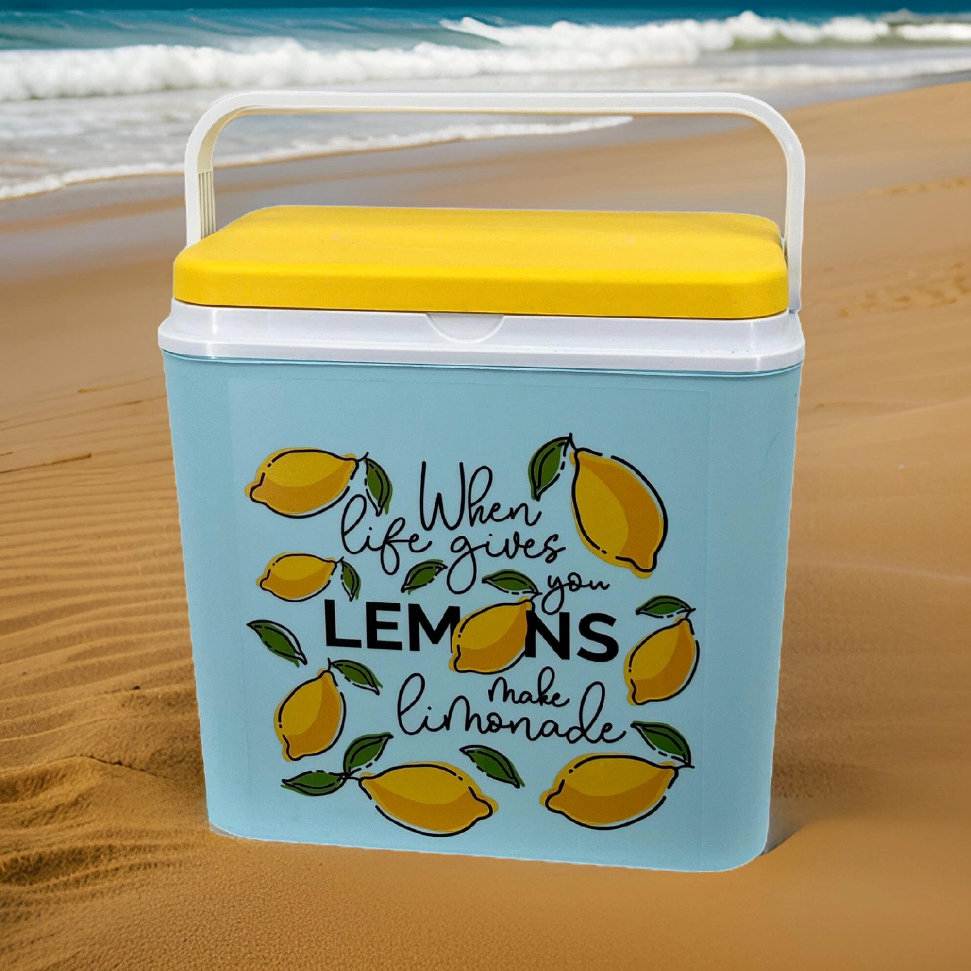Cette glacière passive stylée séduit par son motif LEMONADE associant bleu clair et jaune. Grâce à son isolation bien pensée, elle maintient une basse température même par temps chaud et est idéale pour les sorties en famille, la plage et les pique-niques.