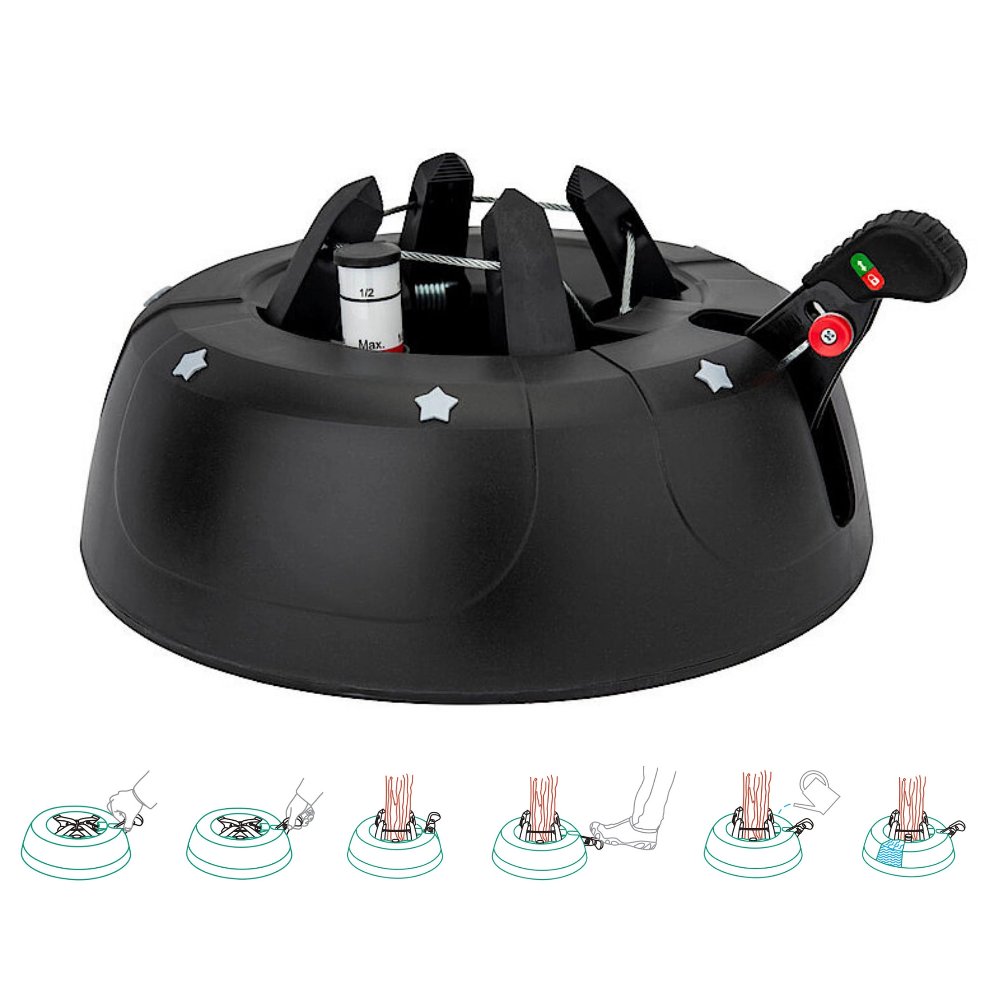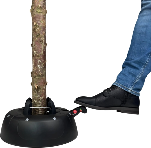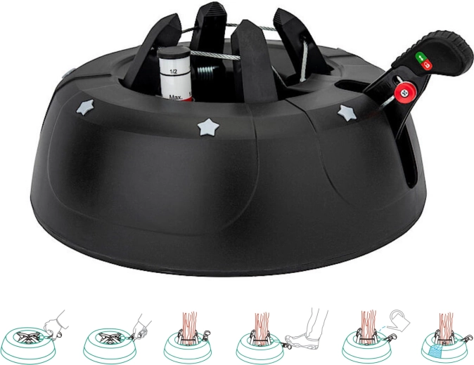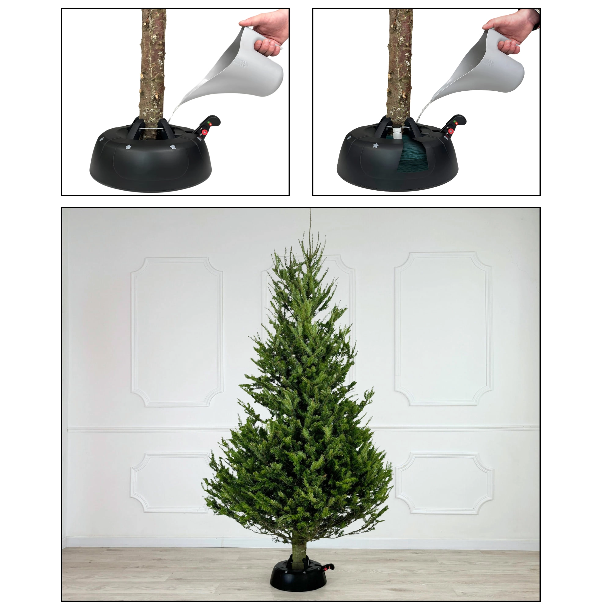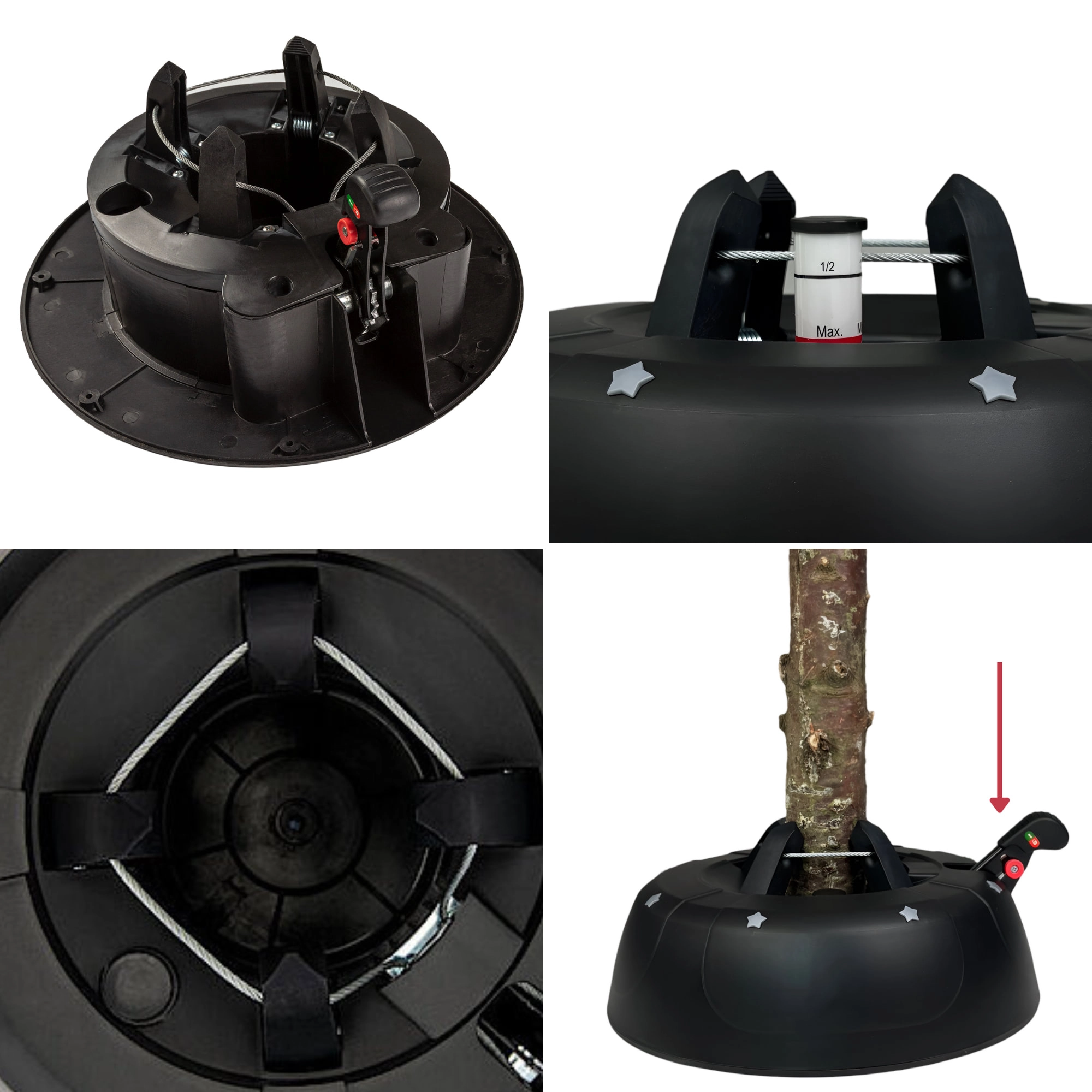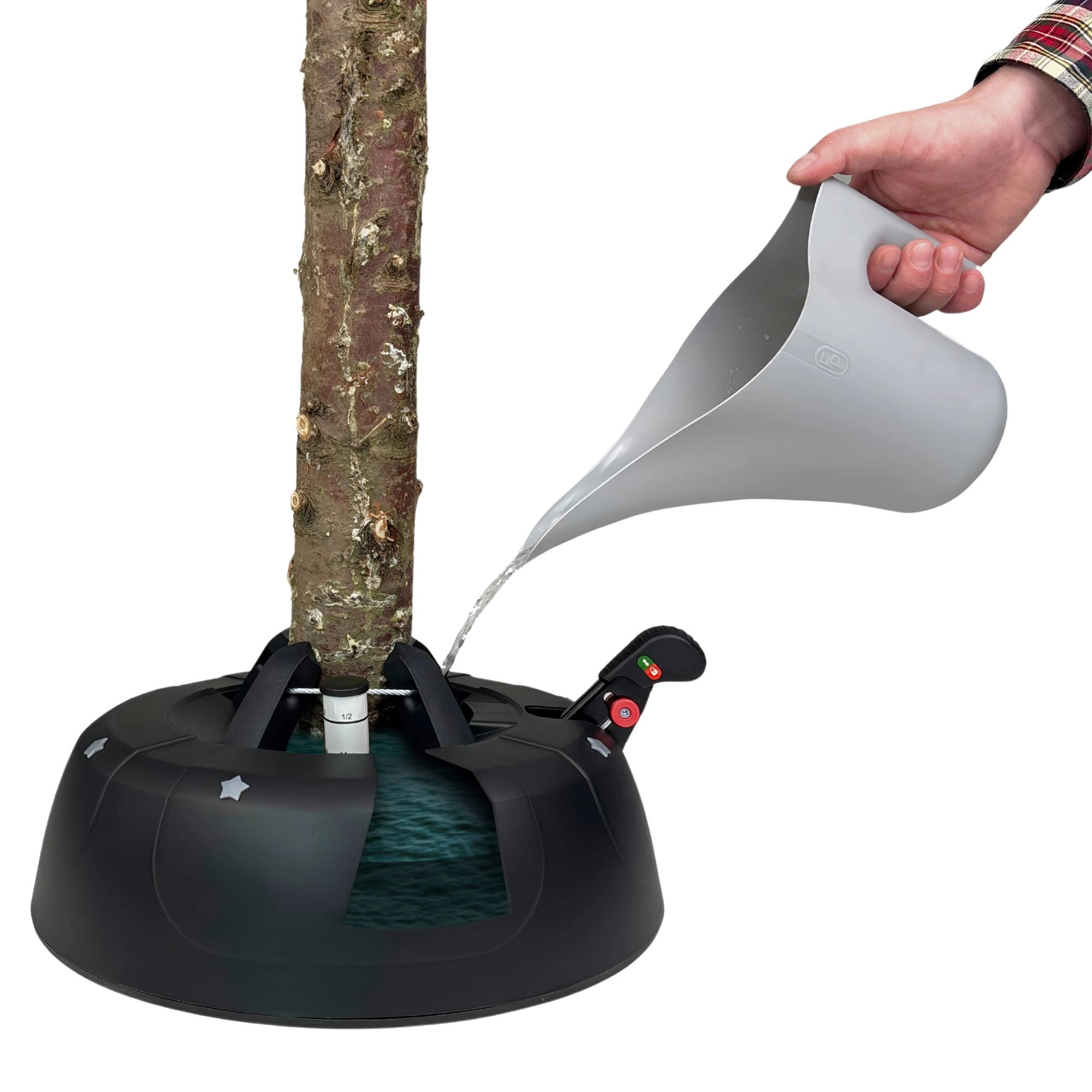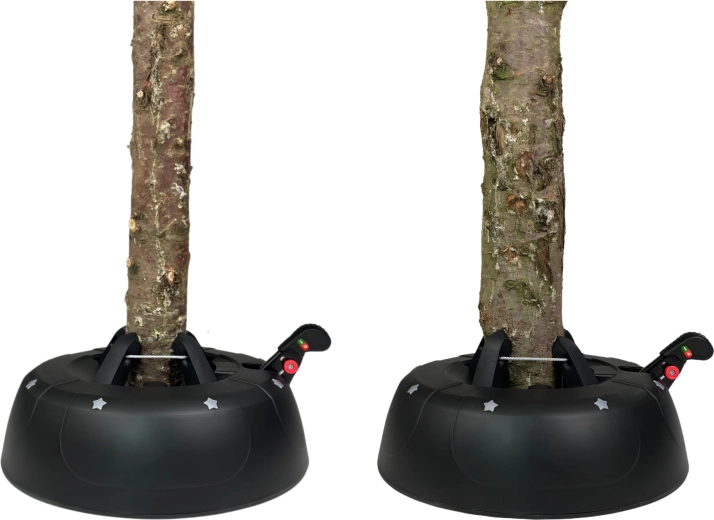Profitez de fêtes sans souci avec un support qui pense à tout – de la fixation rapide du sapin à sa fraîcheur durable. Le système breveté de quatre crochets automatiques en acier serre fermement le tronc en quelques secondes, tandis que la base large et lourde garantit la stabilité durant toute la période de Noël.