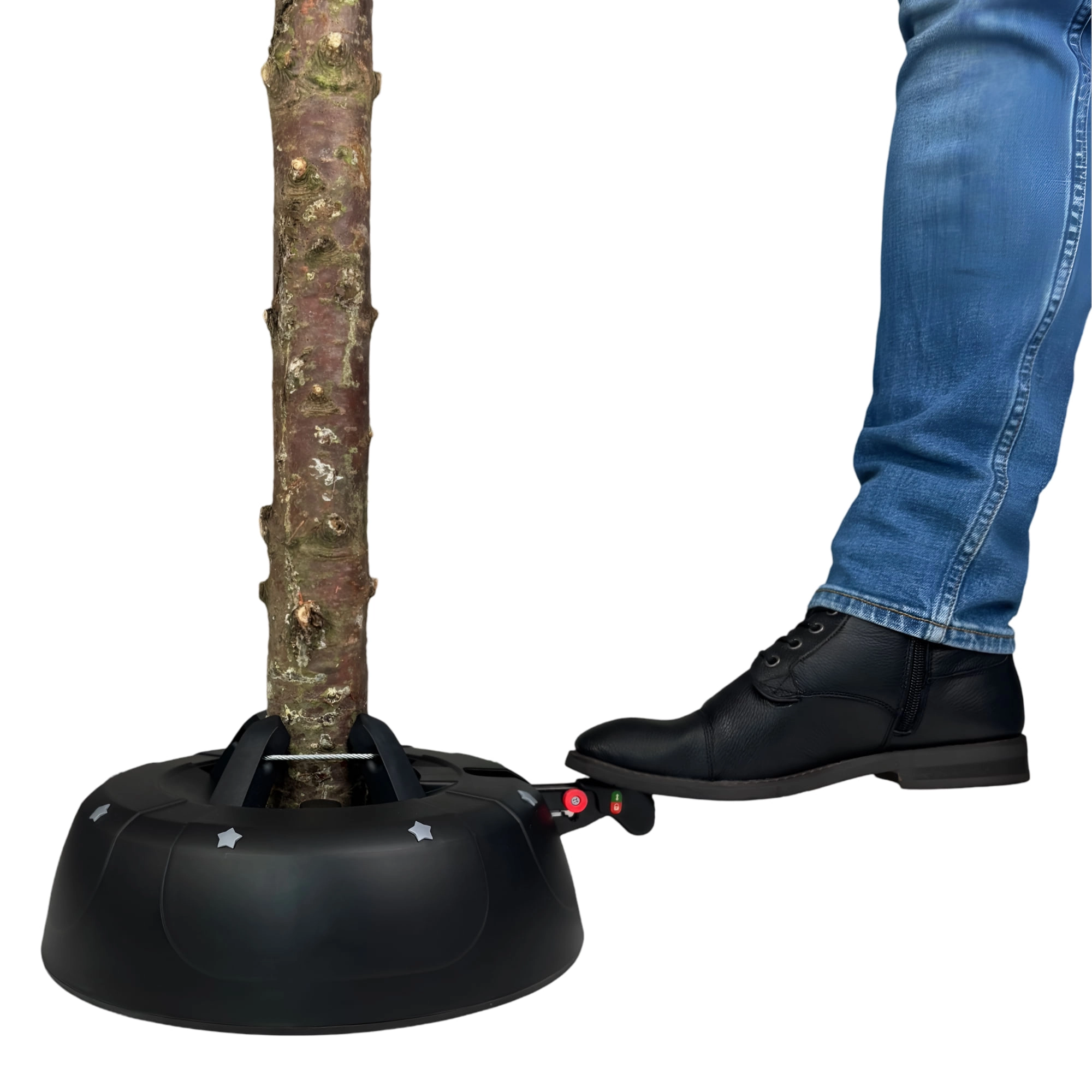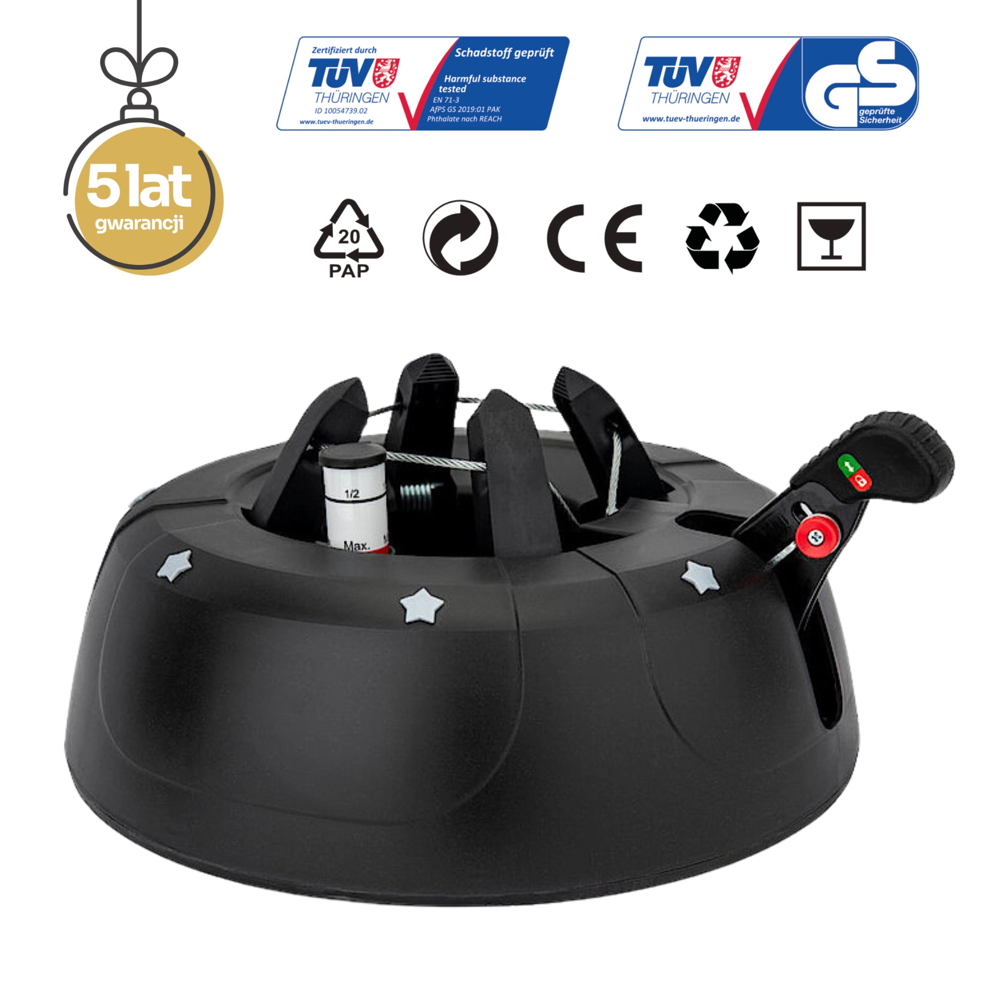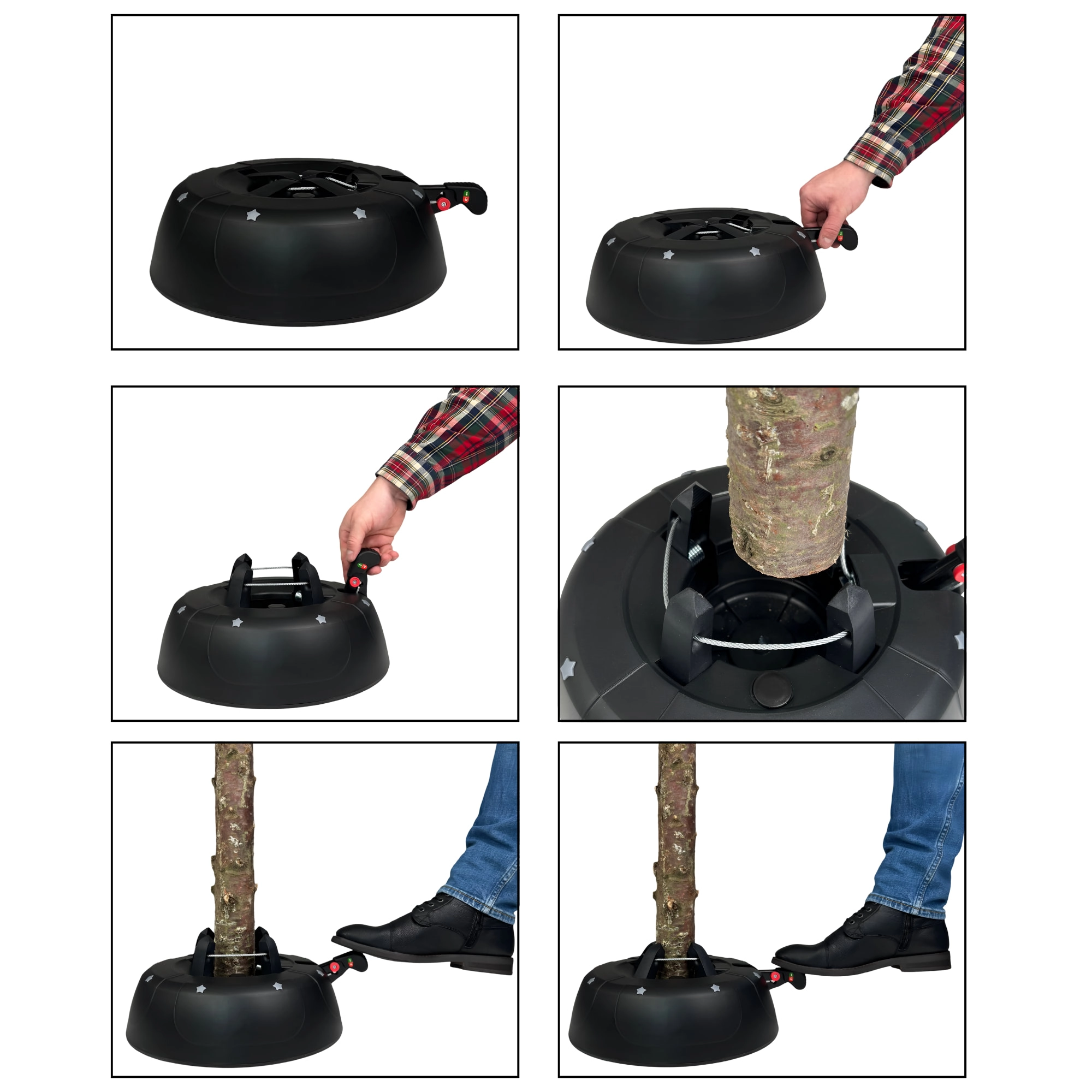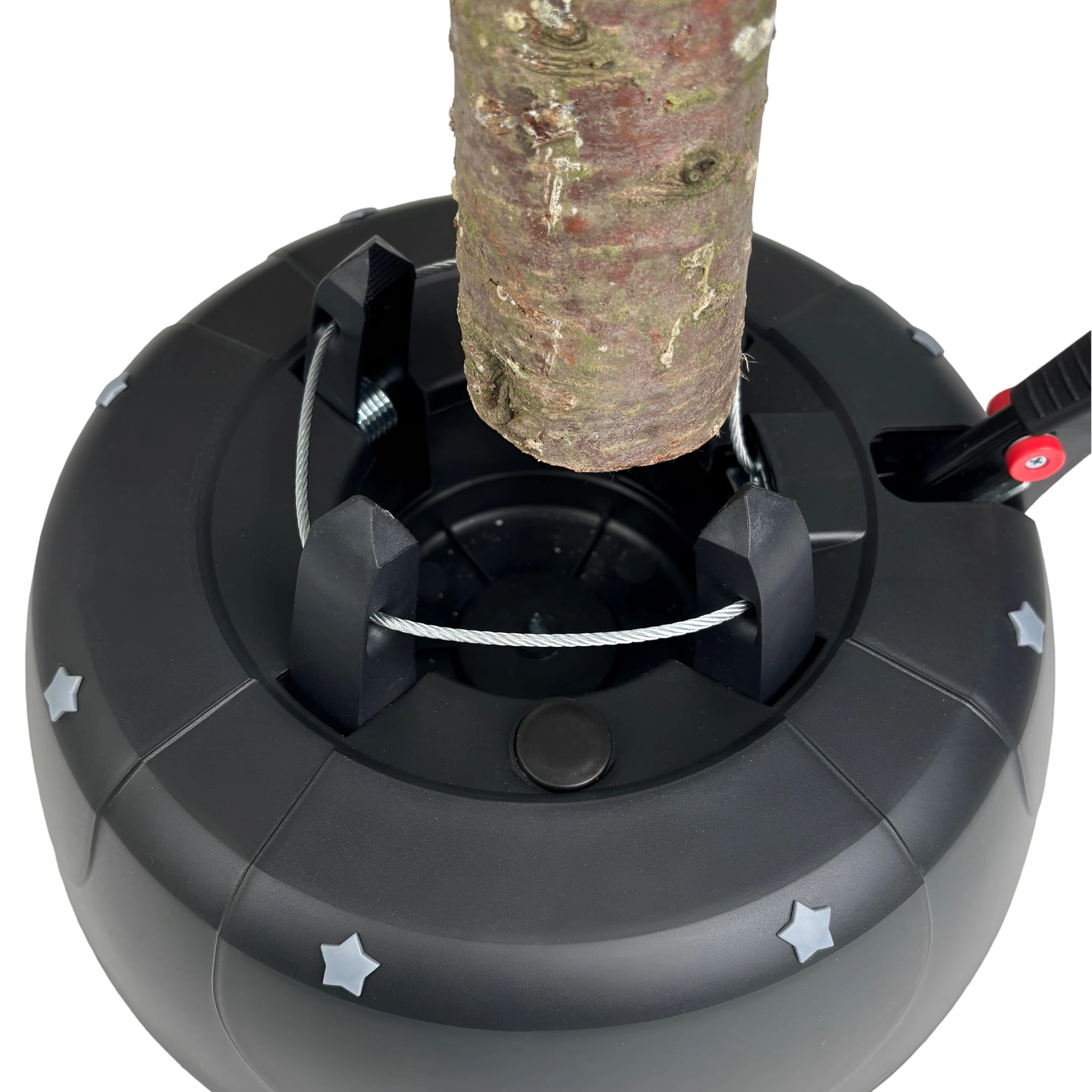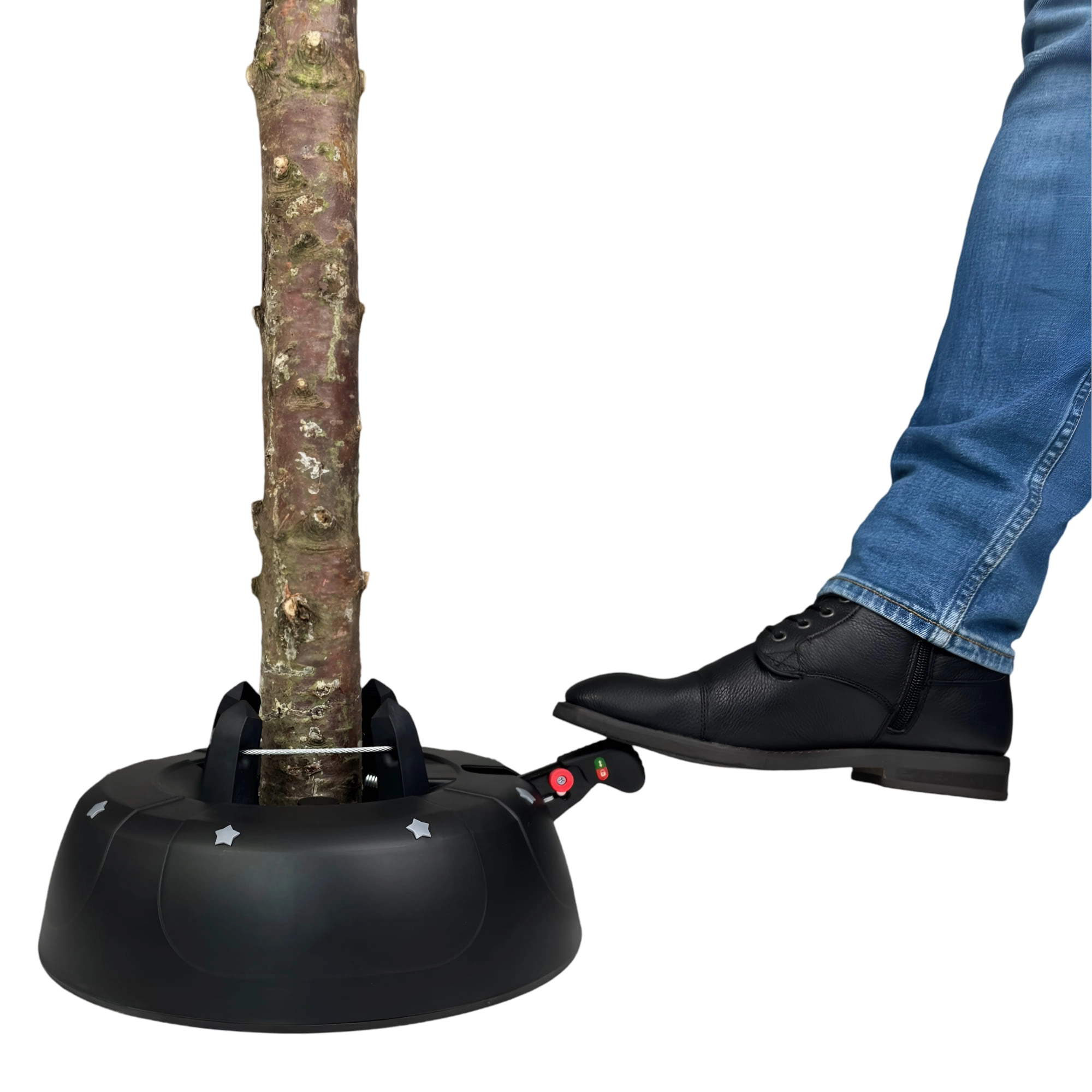 Profitez de fêtes sans souci avec un support qui pense à tout – de la fixation rapide du sapin à sa fraîcheur durable. Le système breveté de quatre crochets automatiques en acier serre fermement le tronc en quelques secondes, tandis que la base large et lourde garantit la stabilité durant toute la période de Noël.