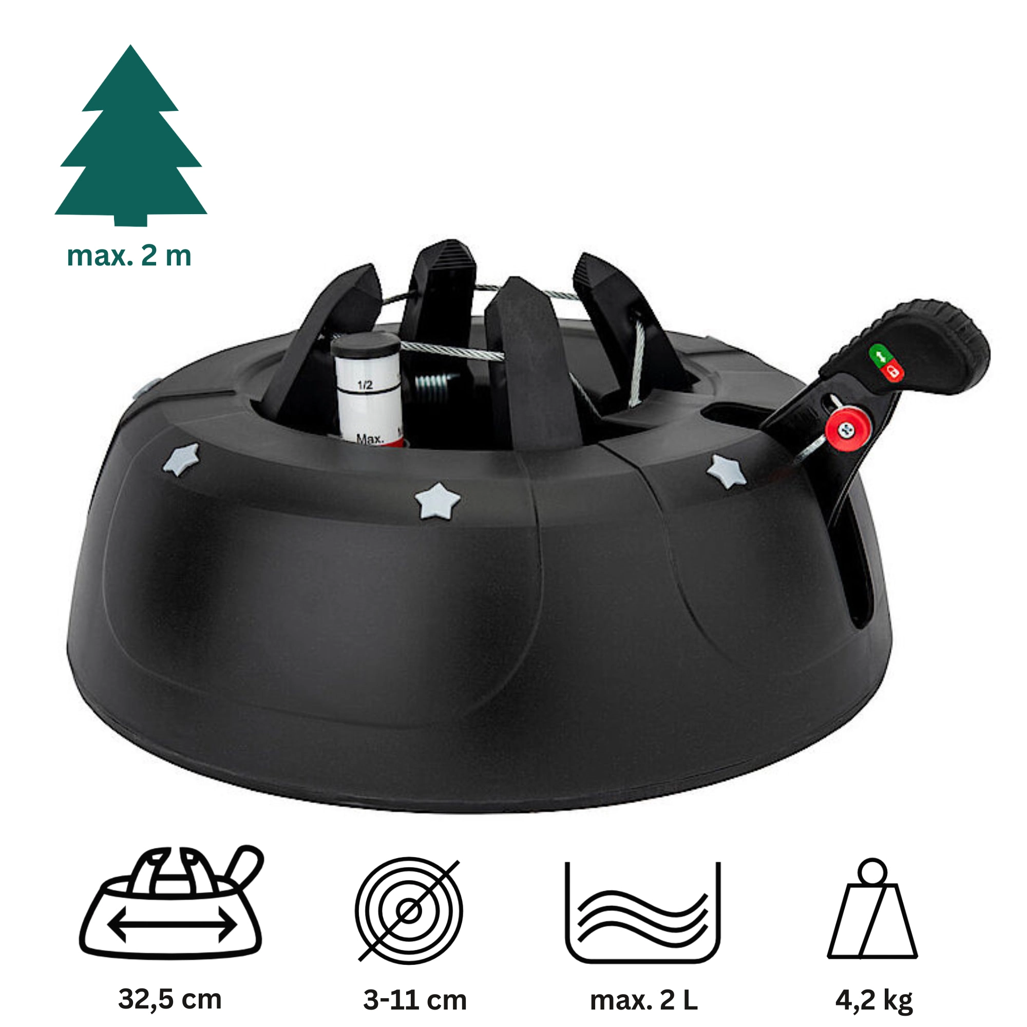 Support de sapin de Noël robuste avec serrage automatique en acier, réservoir d’eau intégré de 2 l et indicateur de niveau. La base stable (4,2 kg, diamètre 34 cm) maintient en toute sécurité un sapin naturel jusqu’à 2 m de hauteur avec un tronc de 3 à 11 cm. L’élégant anthracite orné d’étoiles s’intègre parfaitement à la décoration des fêtes.