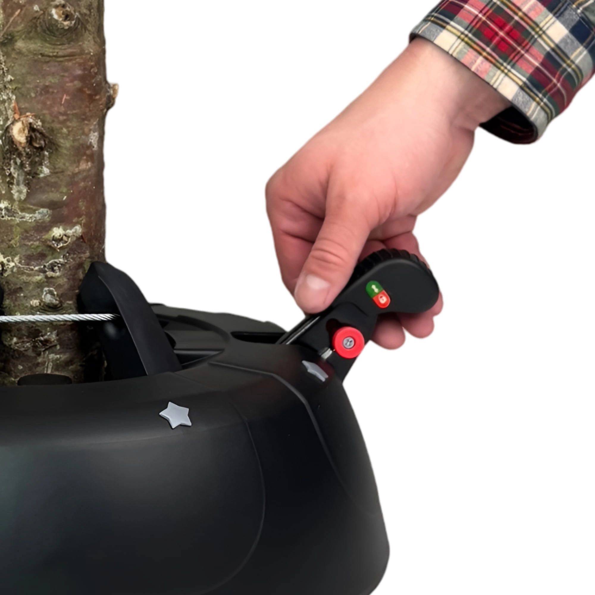 Le système breveté à quatre crochets en acier résistant serre rapidement et fermement les troncs de 3 à 11 cm de diamètre, sans vissage compliqué.
