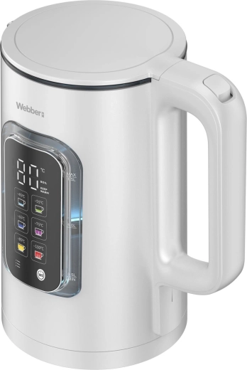 Élégante bouilloire WEBBER ELIYA d’une capacité de 1,5 l offrant une régulation précise de la température en 6 paliers (45–100 °C), un contrôle pratique via un panneau tactile LED et une fonction Keep Warm jusqu’à 12 heures. Grâce à son intérieur en verre, elle ne modifie pas le goût de l’eau, dispose d’une base rotative à 360°, de l’arrêt automatique et d’une protection contre la surchauffe et la marche à sec.