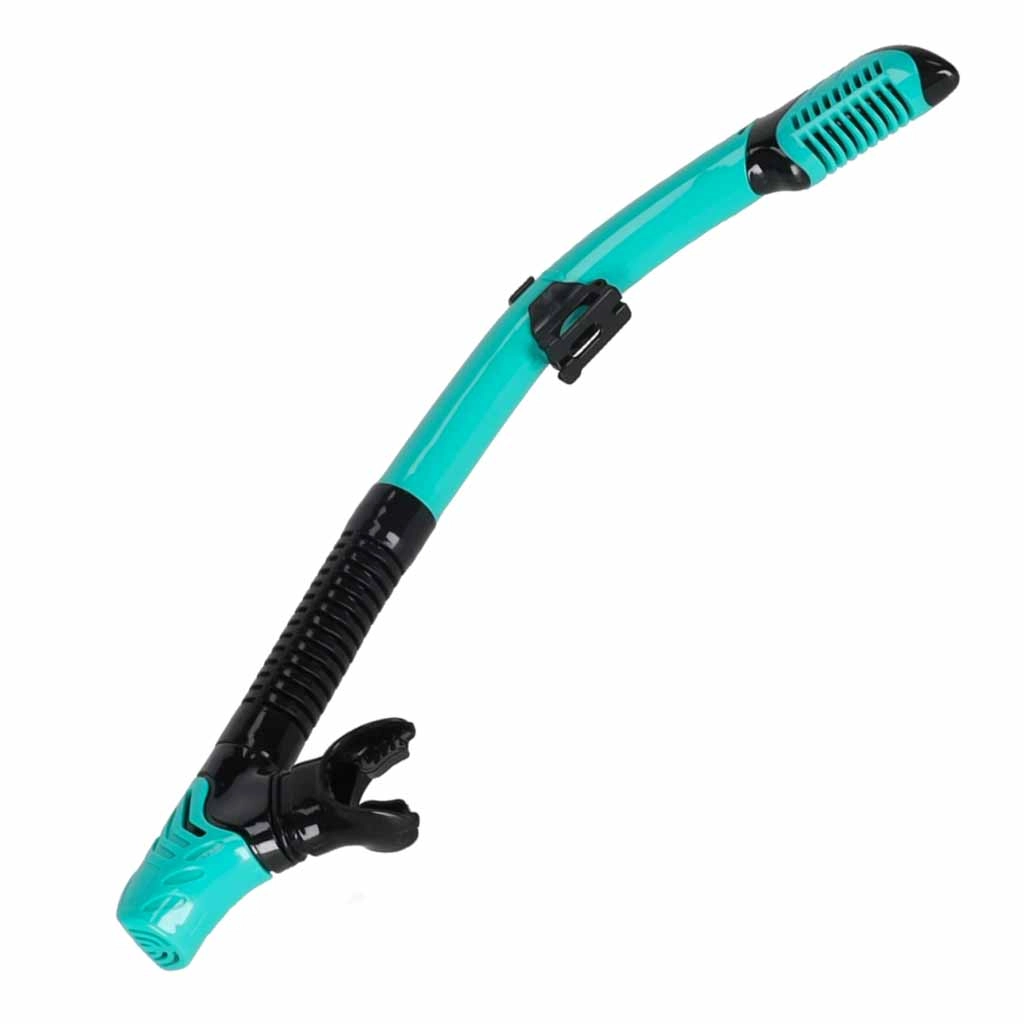 La protection dry-top limite l’entrée d’eau par le haut et la valve de purge facilite son évacuation. La courbure ergonomique et l’embout buccal souple en silicone augmentent le confort lors de longues nages.