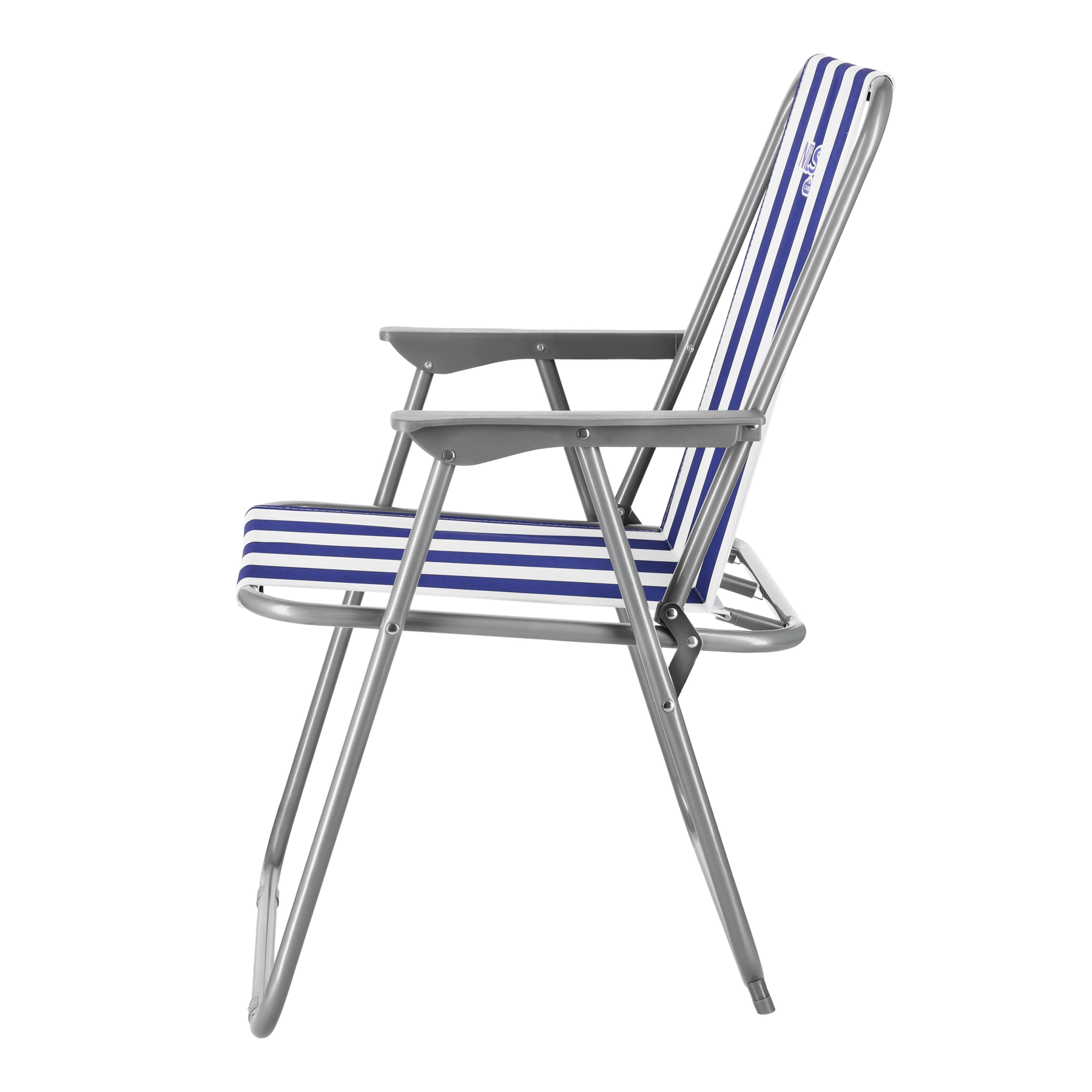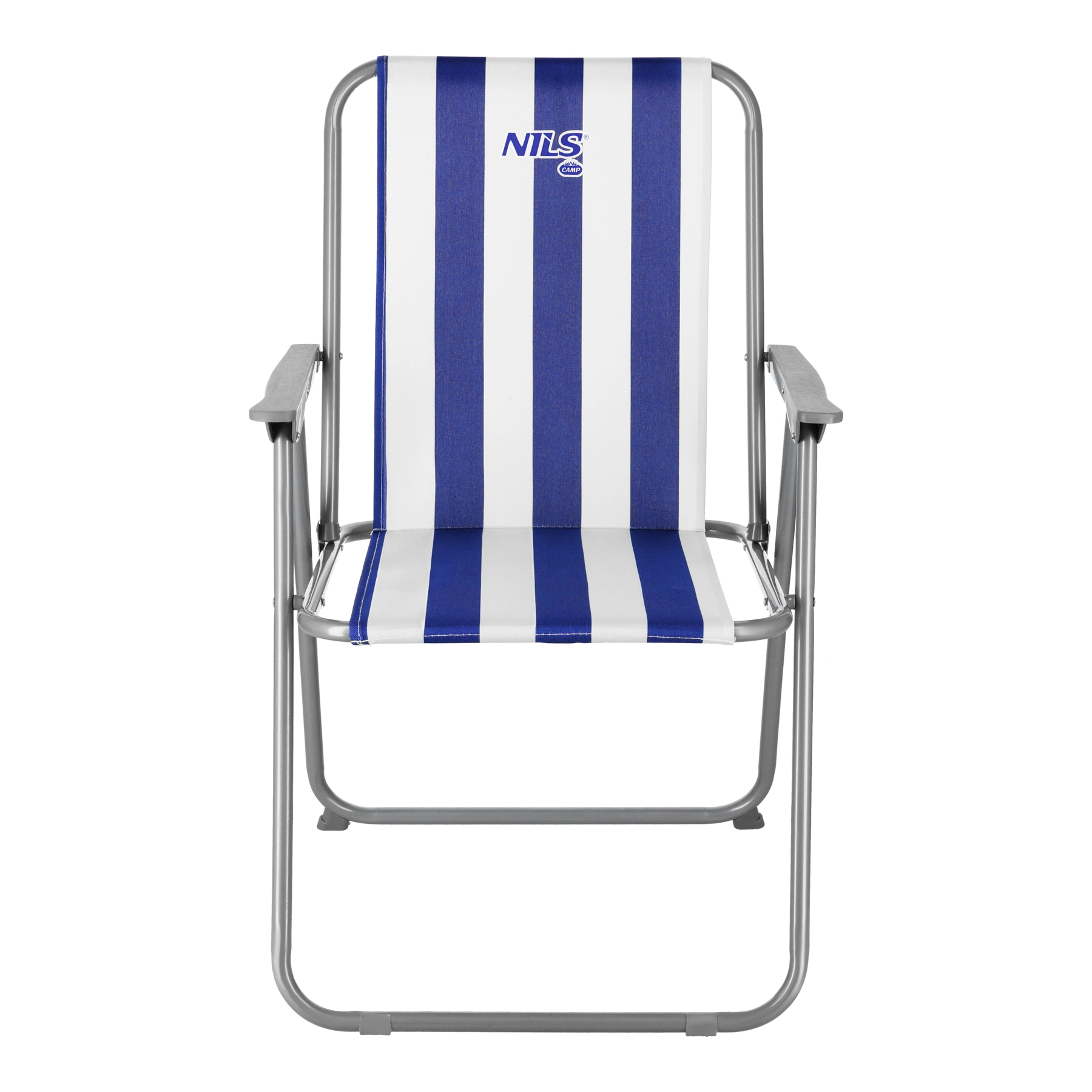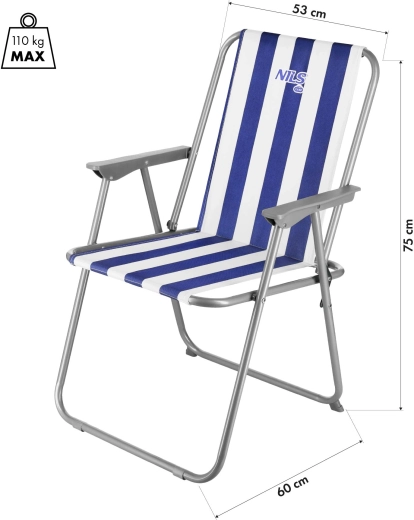 La chaise pliante NILS Camp à rayures bleu‑blanc est un compagnon pratique pour toutes les activités de plein air. Grâce à son cadre en acier, elle reste stable sur l’herbe, le sable et le pavé, tandis que le tissu Oxford 600D assure le confort tant pour une courte pause que pour une assise prolongée.