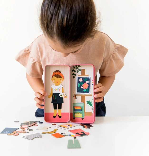 Habillage Magnétique - Atelier est un jouet créatif qui encourage les filles à rêver et à être créatives. Cet ensemble ludique contient plus de 25 pièces magnétiques, permettant de créer différentes scènes.