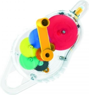 Le mécanisme est entièrement visible : les roues dentées colorées et la dynamo illustrent clairement la transformation de l’énergie en lumière.