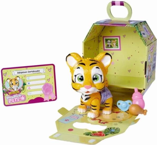 Découvrez la magie avec le mignon tigrou Pamper Petz! Ce tigre interactif avec couche est conçu pour que les enfants puissent explorer le monde des soins aux animaux et vivre la joie d'adopter un nouvel ami. Le tigre possède des fonctionnalités lui permettant de boire de l'eau d'une petite bouteille et de faire pipi dans une couche qui change de couleur selon le niveau d'humidité.