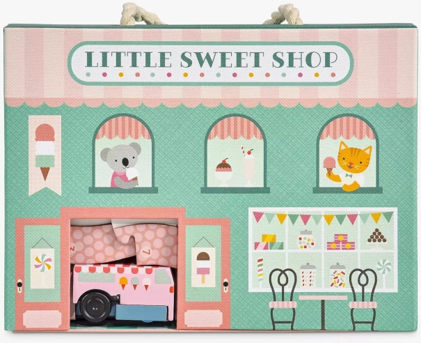 Ce joli set de jeu transporte les enfants dans un monde de douceurs et d’imagination. Remonte la voiture de glacier, regarde-la faire le tour de la pâtisserie et invente tes propres histoires. Grâce à ses dimensions compactes et à sa poignée pratique, il est parfait aussi pour les déplacements.