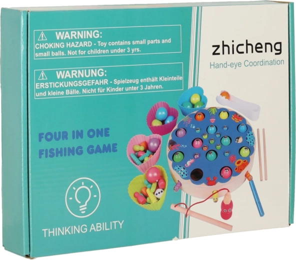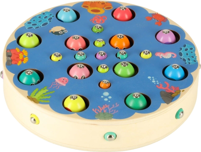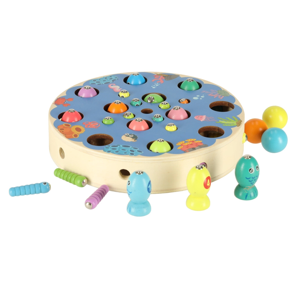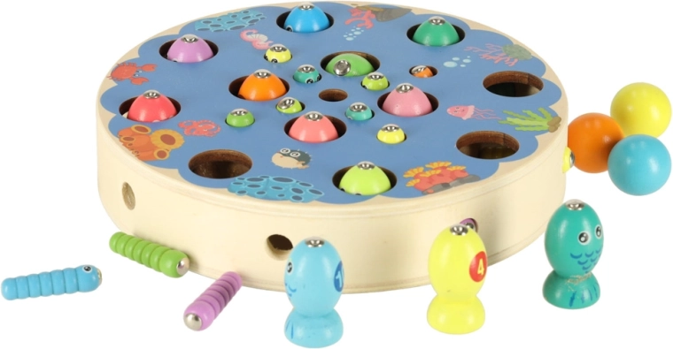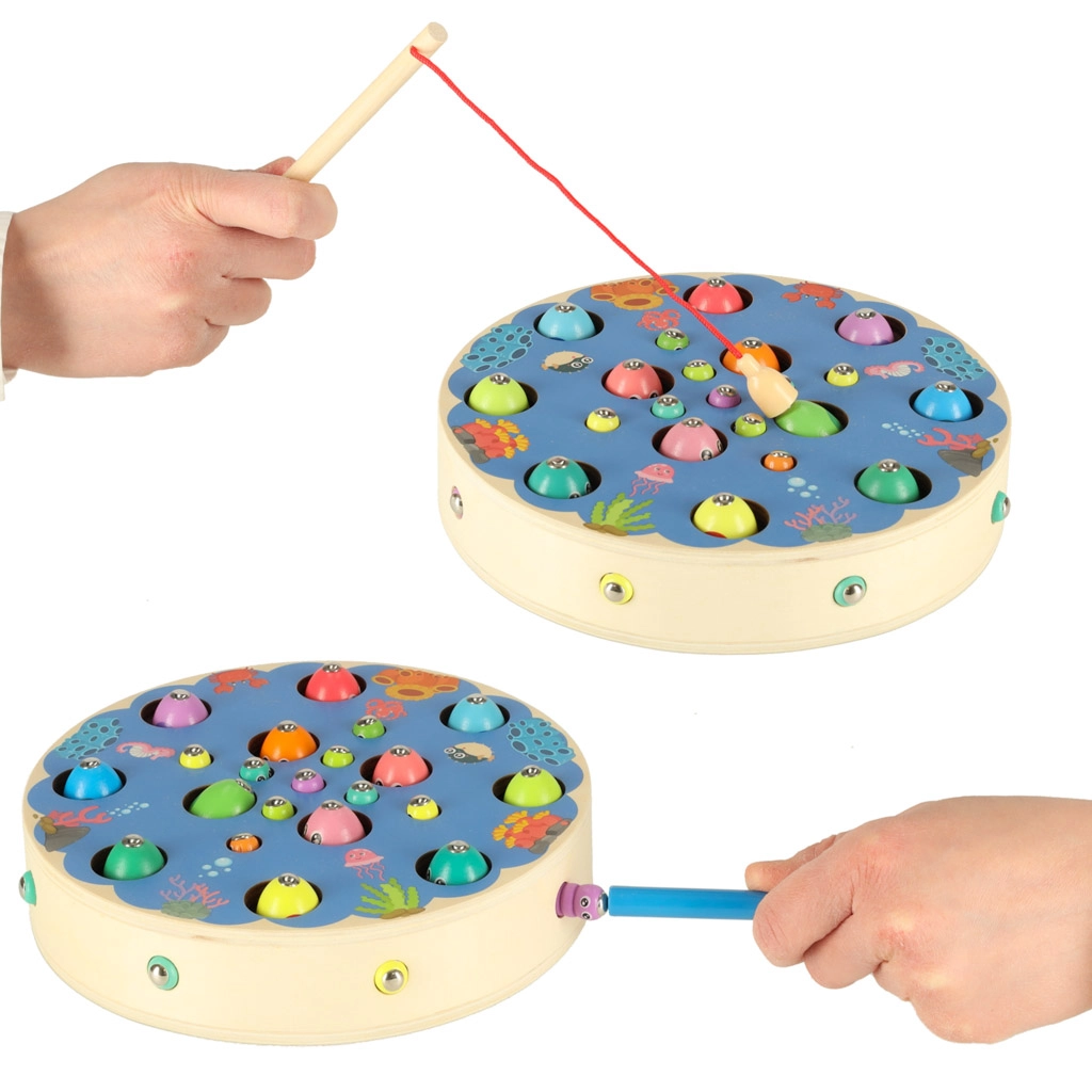 Les enfants attrapent des poissons et des chenilles colorés avec des cannes magnétiques – ils entraînent la précision, la patience et la coordination œil-main de manière ludique.