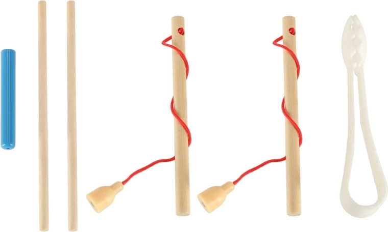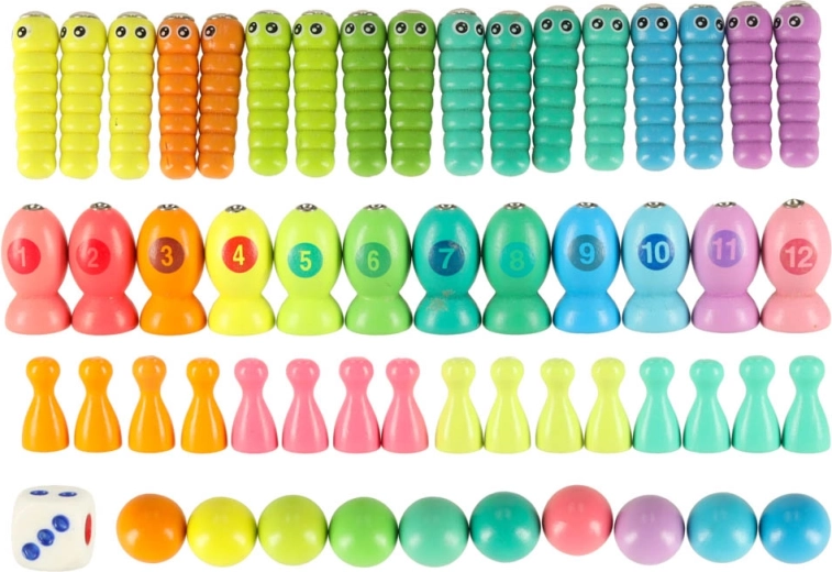 - 1× base en bois, 2× canne, 2× bâtonnets, 1× pince, 4× coupelle en silicone, 10× bille en bois, 12× poissons, 17× chenilles, 16× pions en 4 couleurs, 1× dé