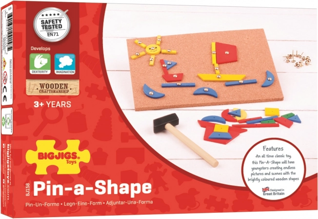 Ce tableau à punaiser coloré est idéal pour les petits bâtisseurs. Les enfants peuvent combiner des formes en bois colorées selon les modèles fournis ou leur propre imagination, puis les fixer avec des punaises brillantes. Un marteau robuste et une plaque de liège sont inclus, pour jouer immédiatement dès le déballage.