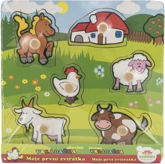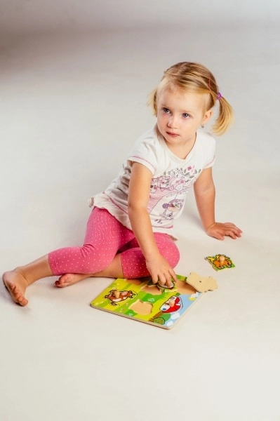 Le puzzle aide les enfants à reconnaître différents animaux de la ferme, tels que le cheval, la chèvre, le mouton, la poule et la vache. Chacun d'eux a une forme et une couleur unique.