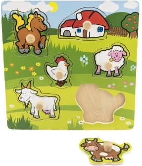 Ce puzzle comprend au total 5 animaux colorés, notamment un cheval, une chèvre, un mouton, une poule et une vache, qui sont faciles à saisir grâce aux petites poignées en bois. Chaque pièce a sa place sur le plateau en bois, ce qui aide également les enfants à apprendre à placer correctement chaque pièce.