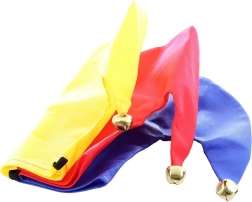 Chapeau de clown coloré en jaune, rouge et bleu avec des grelots métalliques pour un effet ludique à chaque mouvement.