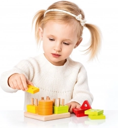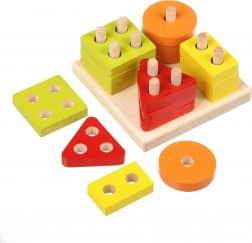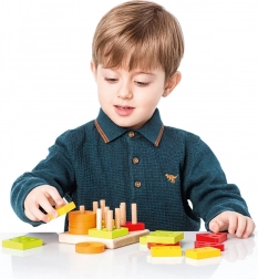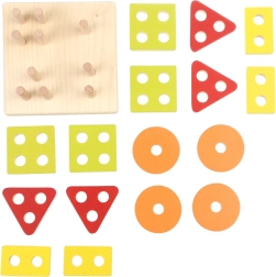 Des cercles, carrés, triangles et rectangles colorés, perforés, s’enfilent sur les chevilles de la base. Les enfants trient ainsi naturellement selon la forme et la couleur et exercent leur pensée logique.