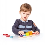 Grâce aux différentes pièces géométriques et aux couleurs répétées, les enfants s’initient facilement au tri, à l’association et au bon positionnement sur les chevilles de la base.