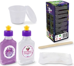 La procédure est simple : mélangez la quantité indiquée de colle avec l’activateur, ajoutez la poudre lumineuse et remuez – le slime commencera à épaissir progressivement. Lorsqu’il commence à se détacher du récipient, vous pouvez le pétrir à la main jusqu’à obtenir la bonne consistance. Le slime est sans danger pour les enfants et ne contient aucune substance toxique ni de borax.