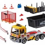 - 1 figurine d’ouvrier du bâtiment, camion avec module d’extension interchangeable, benne basculante, remorque, boîte à outils avec couvercle, jerrican et autres accessoires
